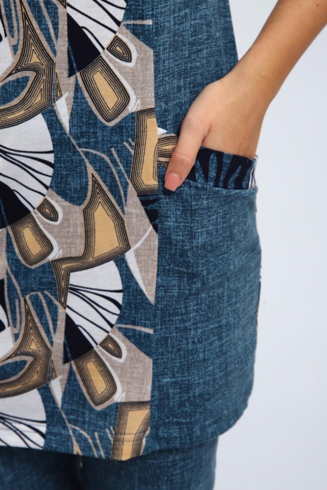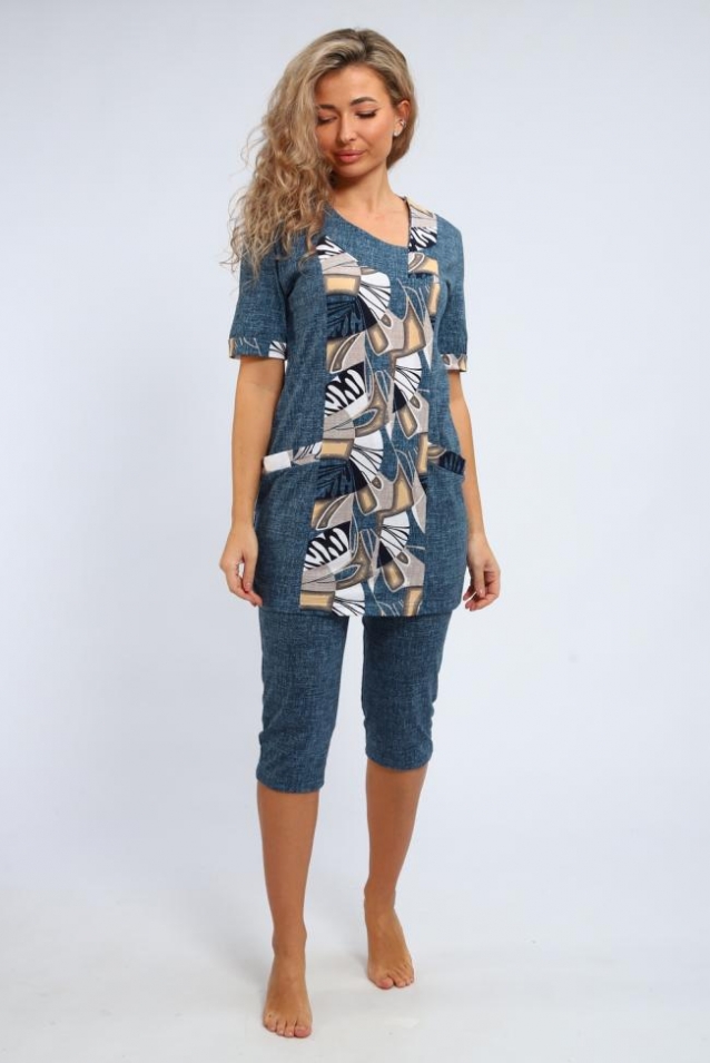 Женский костюм выполнен из мягкого хлопка, поэтому в нем комфортно в любое время года. Такой трикотажный костюм легко использовать как повседневный наряд для дома. Фасон продуман до мелочей: удобный крой туники с карманами и коротким рукавом отлично подходит как летний вариант, а в прохладное время костюм можно носить как демисезонный. Для полных женщин костюм станет удачным решением: эластичный материал хорошо садится на фигуру и не сковывает движений, долго сохраняет аккуратный вид, не вытягивается и остаётся привлекательным даже при длительном использовании. Благодаря мягкой ткани и свободному крою в нем удобно отдыхать дома