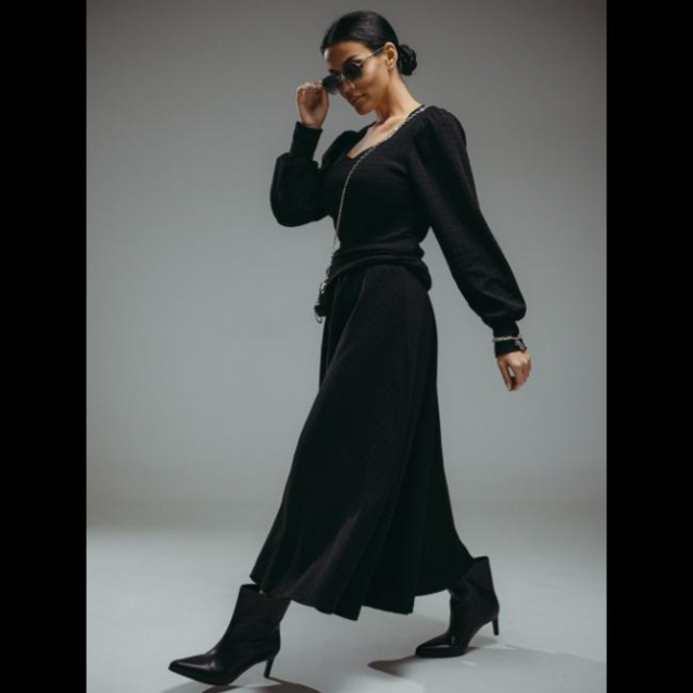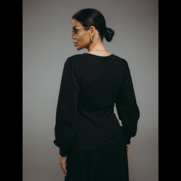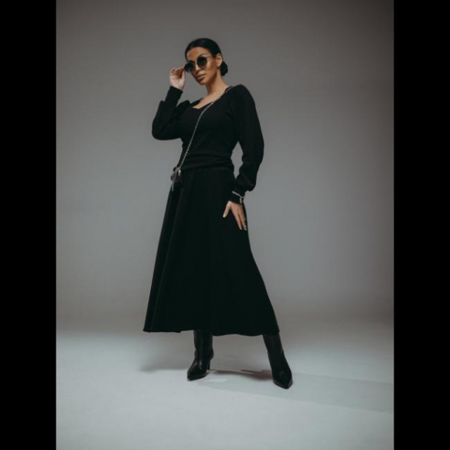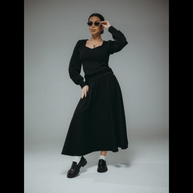 Костюм женский состоит из лонгслива и юбки. Лонгслив прилегающего силуэта длиной до бёдер с объёмными рукавами. Юбка-полусолнце длиной до середины икры на поясе. Комментарии к товару
