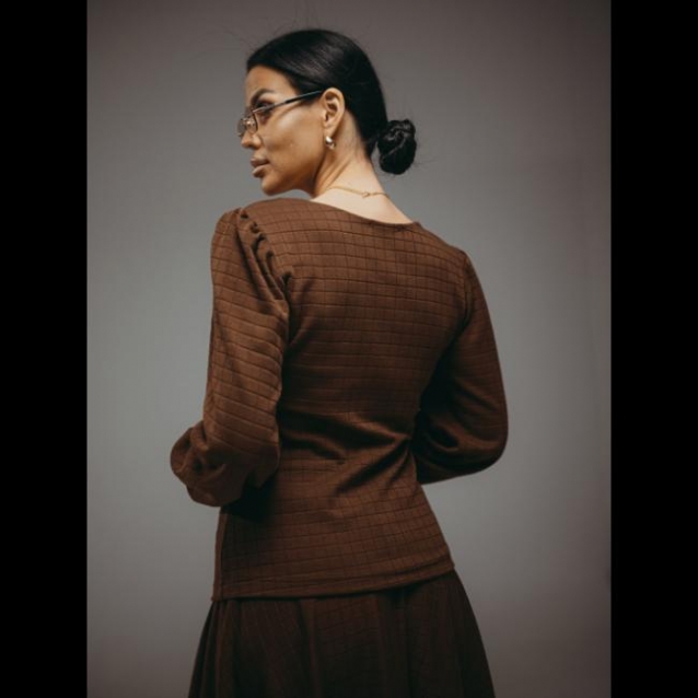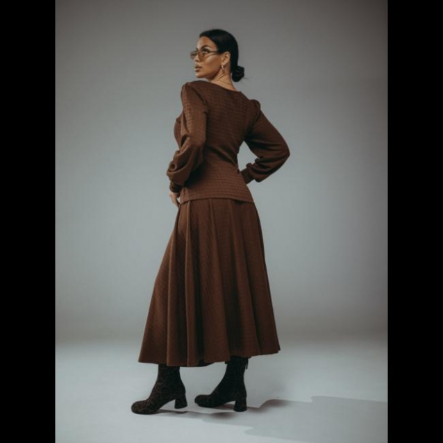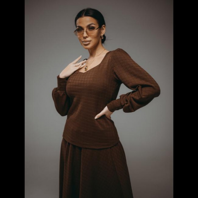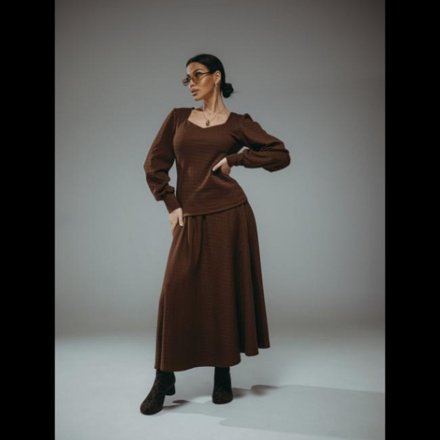 Костюм женский состоит из лонгслива и юбки. Лонгслив прилегающего силуэта длиной до бёдер с объёмными рукавами. Юбка-полусолнце длиной до середины икры на поясе.