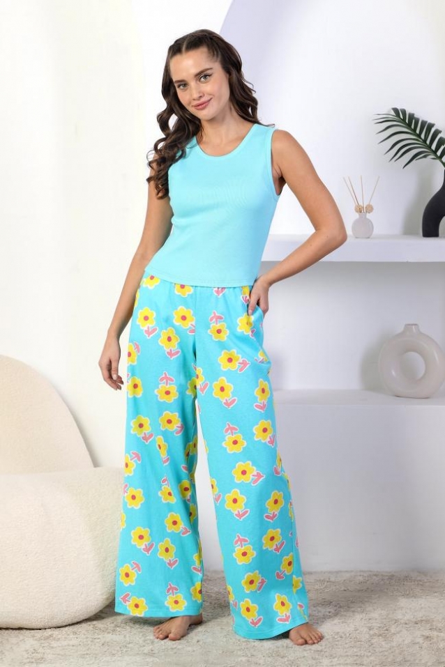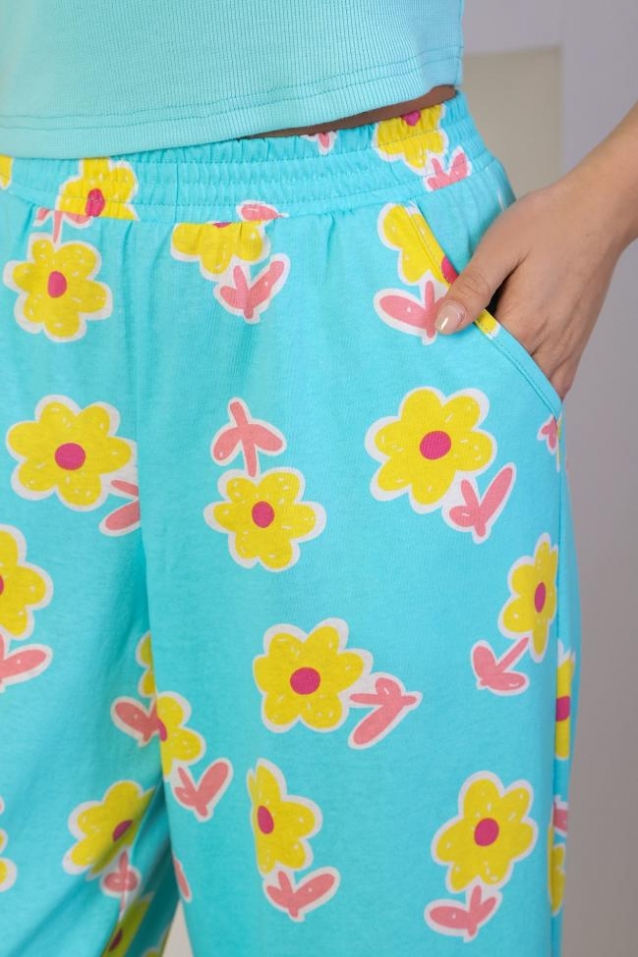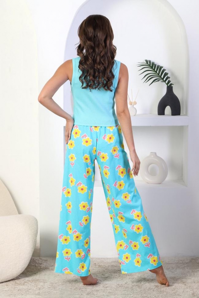 Костюм женский, состоящий ихз майки и брюк. Майка - из трикотажного эластичного гладкокрашенного полотна "кашкорсе" классического покроя с окантованными основным материалом горловиной и проймами. Брюки - из трикотажного полотна "кулирка" с набивным цветочным рисунком, широкие, прямые,на притачном поясе с эластичной тесьмой внутри и карманами в боковых швах, входы в которые окантованы основным материалом.