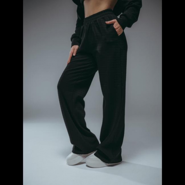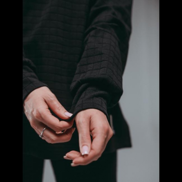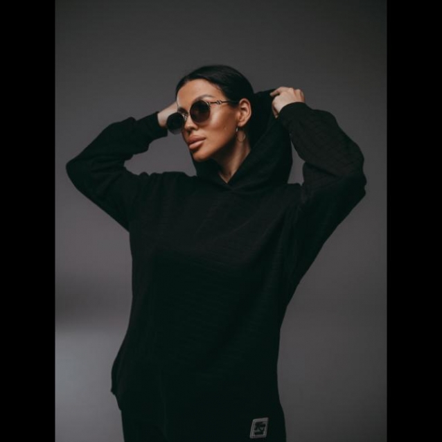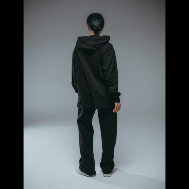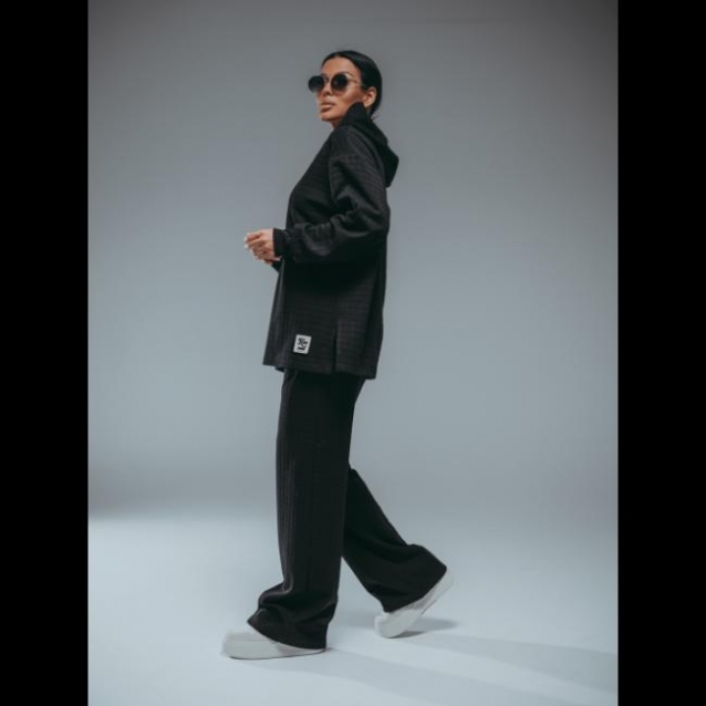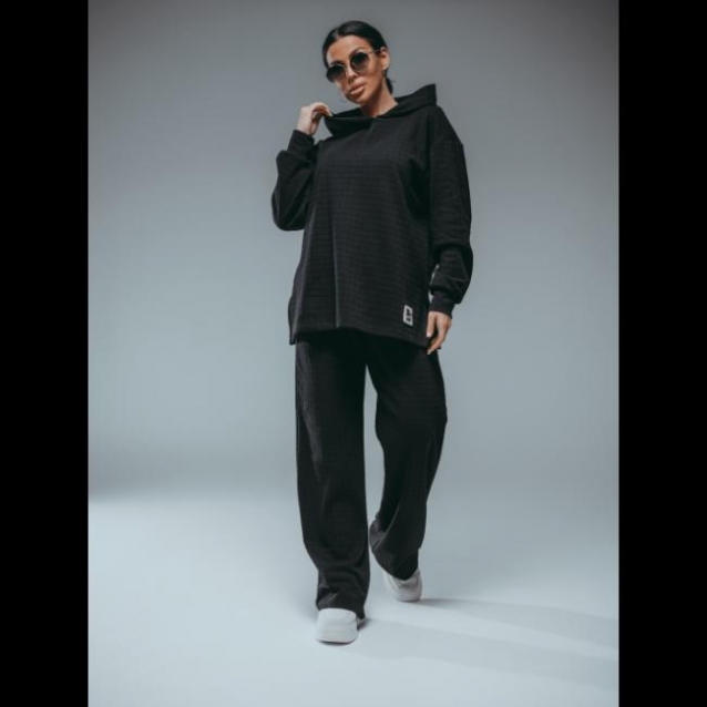 Худи – прямого кроя со спущенной линией плеча, длинным втачным рукавом на манжете. Брюки прямые от бедра с отрезным поясом и карманами.