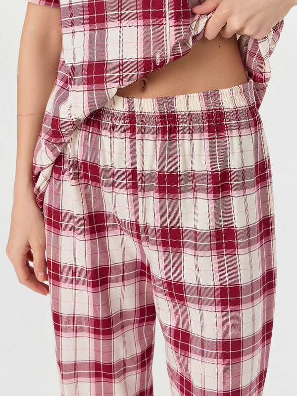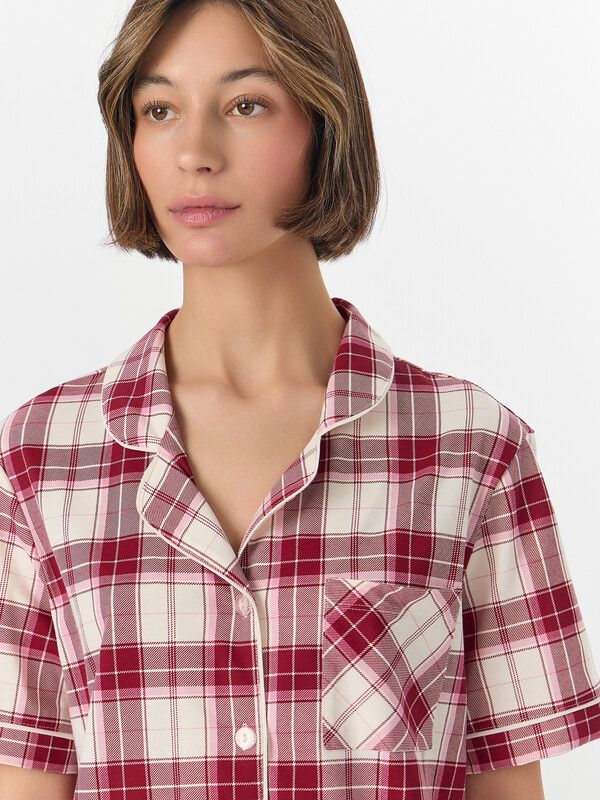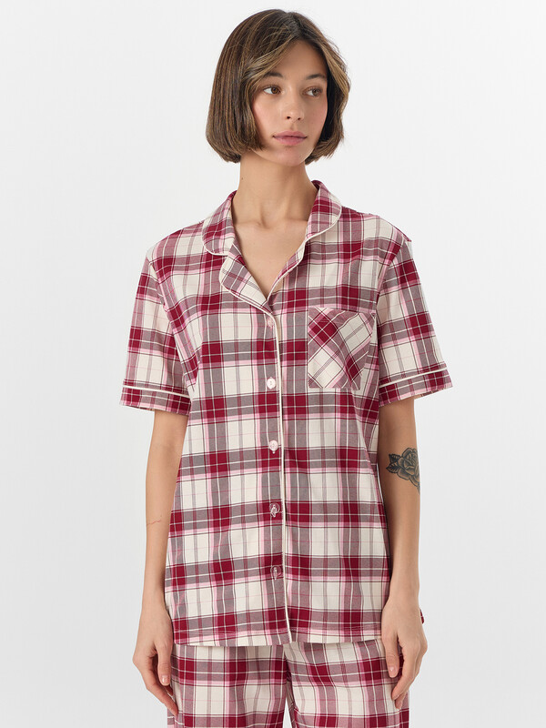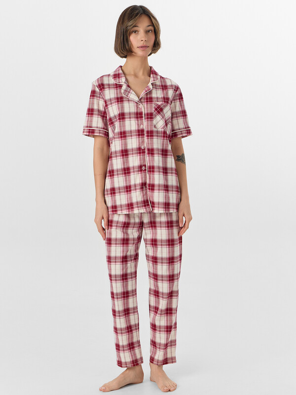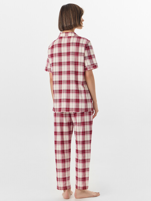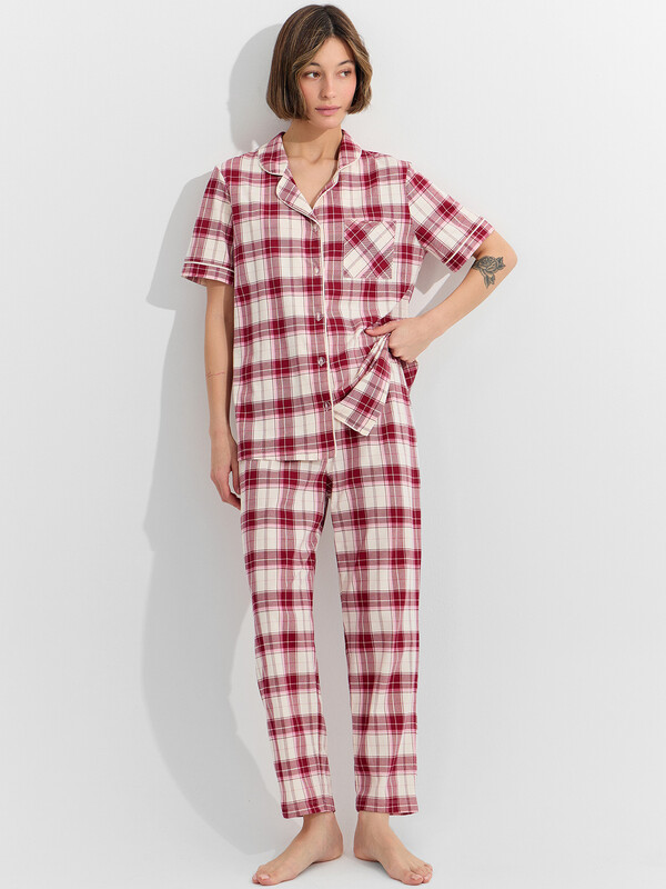 Рубашка с накладным карманом на груди сочетает практичность и элегантность. Отложной воротник с лацканами, декорированными контрастным кантом, и короткие рукава с аккуратными манжетами создают законченный образ. Застежка на пуговицах добавляет удобства в использовании. Брюки свободного кроя с эластичным поясом обеспечивают идеальную посадку и максимальный комфорт. Пижама выполнена из натурального хлопка, который обладает высокой воздухопроницаемостью, мягкостью и отличной гигроскопичностью. Наслаждайтесь непревзойденным комфортом в этой новогодней пижаме — она станет вашим надежным спутником для уютных вечеров и комфортного сна, даря ощущение праздника каждый день! 100% хлопок Комментарии к товару
