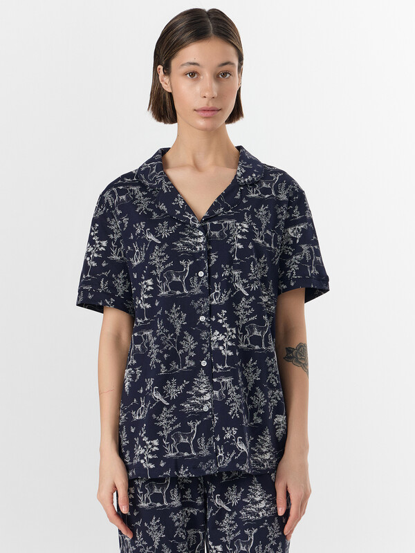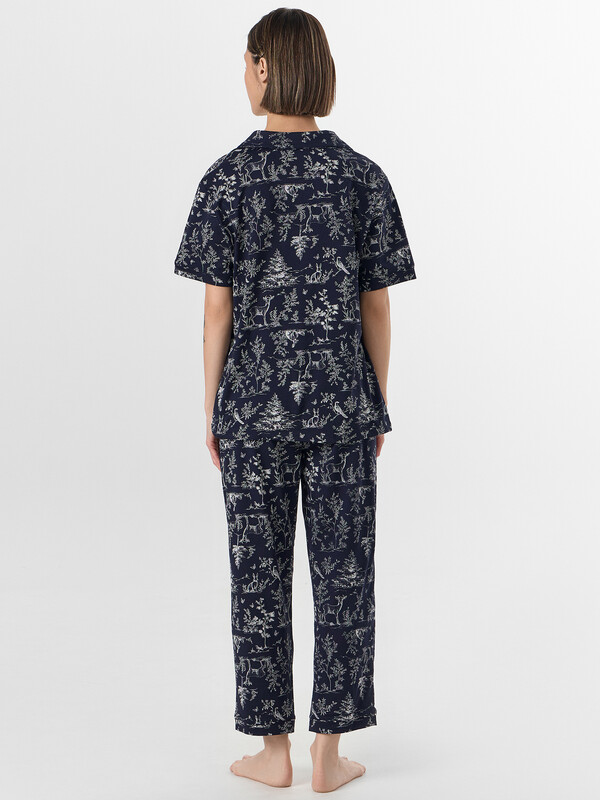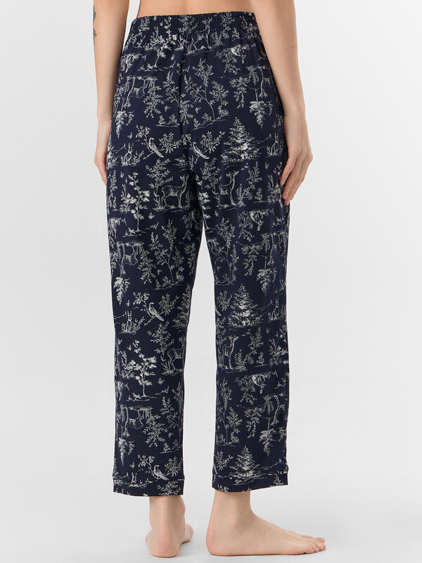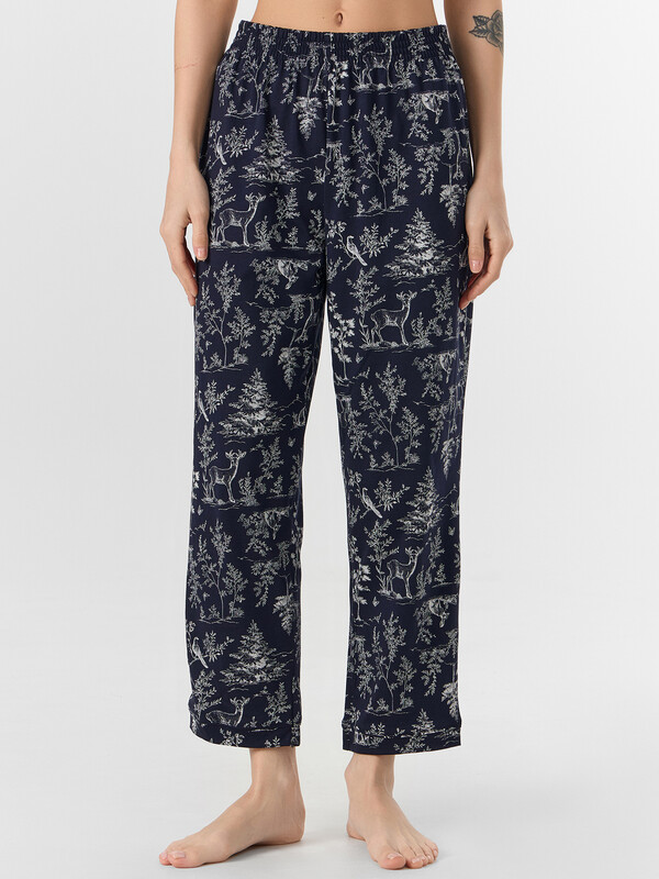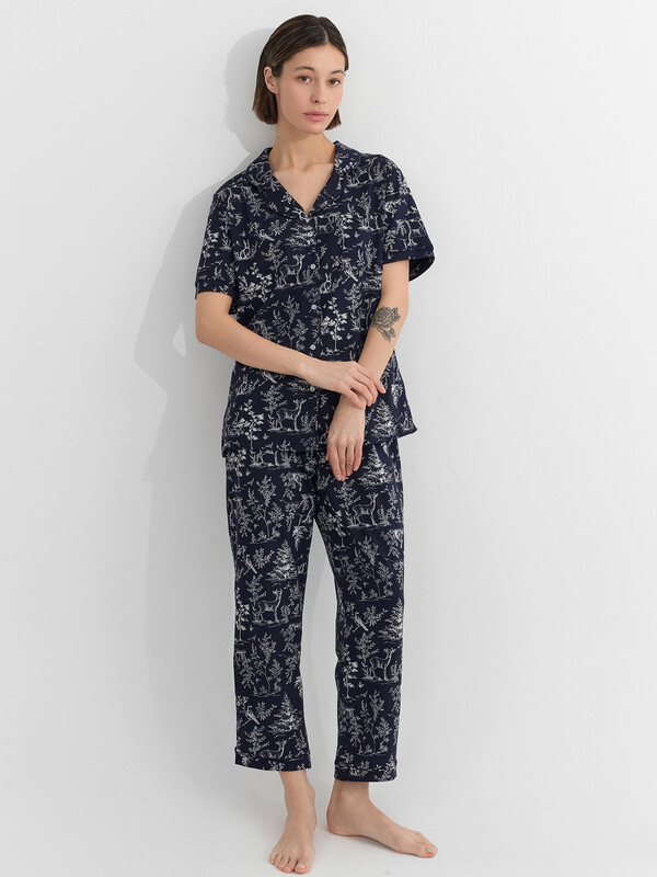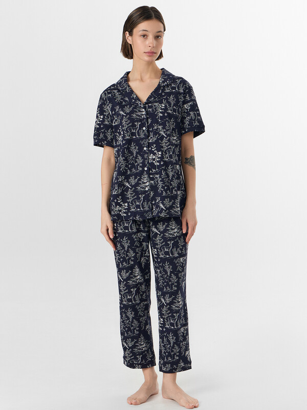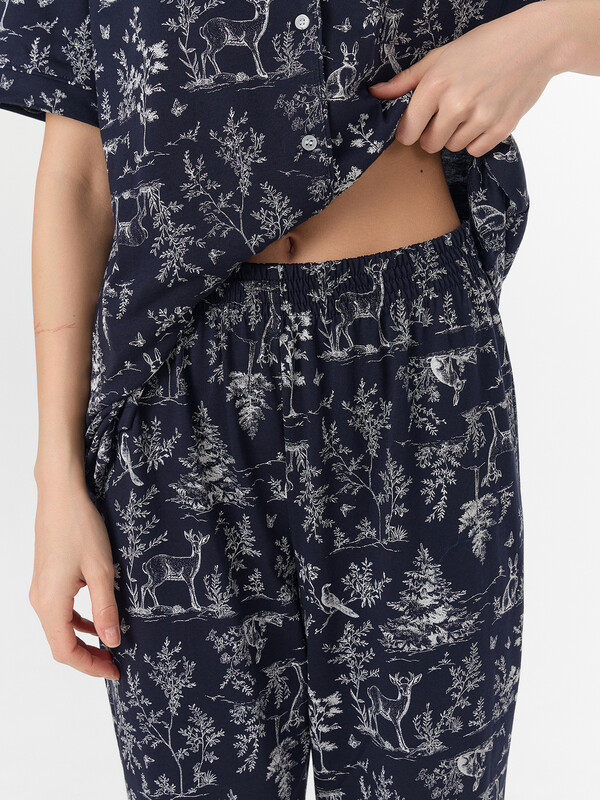 Бриджи с высокой талией и мягкой резинкой не стесняют движений. Манжеты на штанинах с декоративной отделкой гармонично сочетаются с жакетом. Комплект из натурального хлопка обеспечивает приятные тактильные ощущения и идеально подходит для расслабленного времяпрепровождения дома, предлагая баланс яркого дизайна и повседневного удобства.