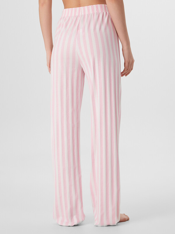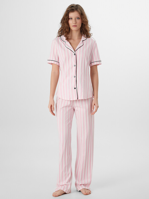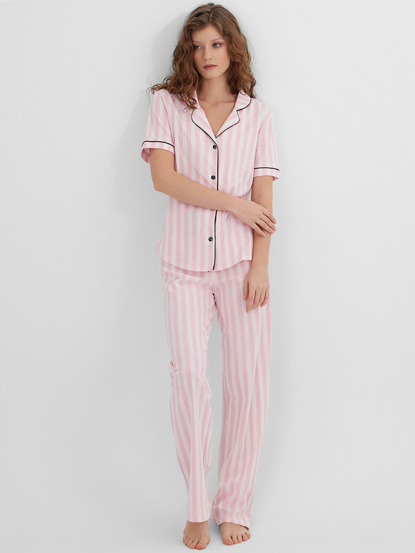 Аккуратная застежка на пуговицы и контрастная отделка по краям жакета подчеркивают внимательное отношение к деталям. Брюки на мягкой резинке обеспечивают удобную посадку и не создают давления на талию, что особенно важно для полного расслабления.