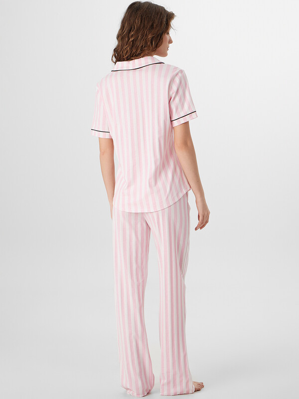 Комплект отлично подойдет для спокойного сна, утреннего кофе или неспешных домашних дел. Классическая полоска и нейтральная цветовая гамма делают его универсальным и практичным выбором для повседневной носки.
