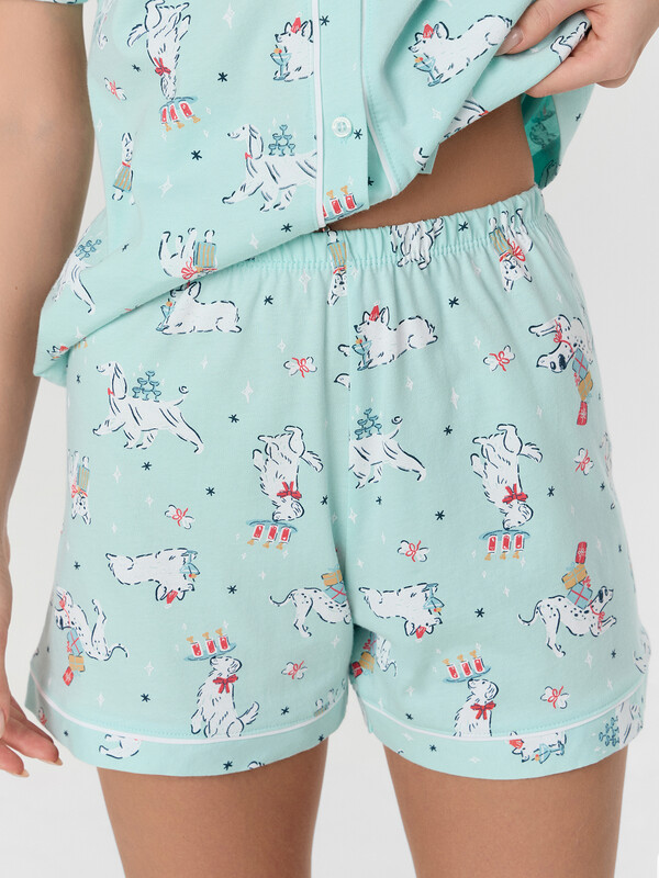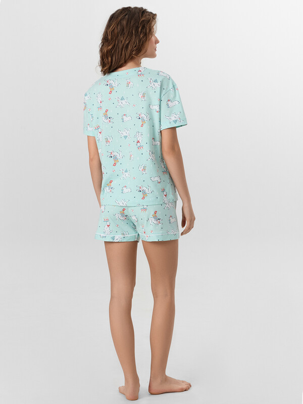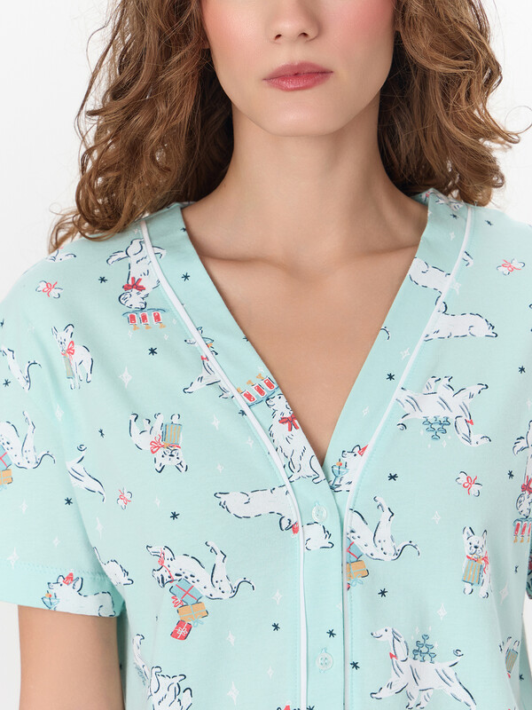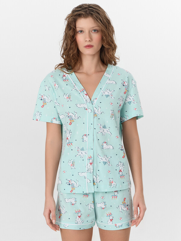 Рубашка с отложным воротником и короткими рукавами застегивается на аккуратные пуговицы. Свободные шорты с эластичным поясом бережно облегают талию, не стесняя движений во время отдыха или домашних дел.