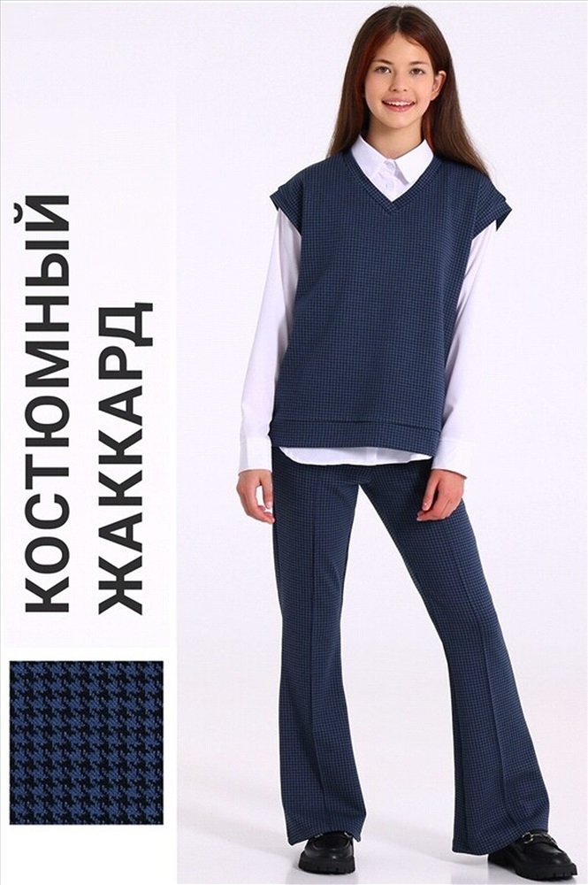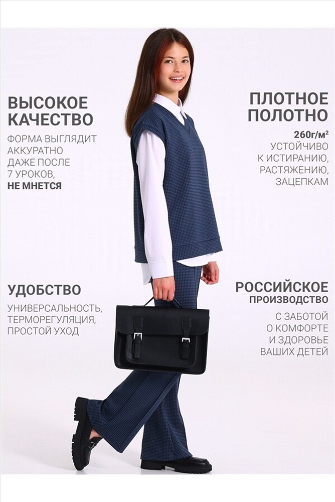 ID товара: 1187632 Акции: -16%, до 01.12.2025 Состав: Хлопок 55% + Полиэстер 42% + Лайкра 3% Сезон: Демисезон Длина: Полная Фасон: Прямой Рукав: Без рукавов Крой брючин: Прямой Рисунок: Гусиная лапка Декоративные элементы: Принт Основная ткань: Хлопок Стиль: классический Страна бренда: Россия Страна производства: Россия Школьный костюм для девочки, состоящий из жилета и брюк. Комментарии к товару