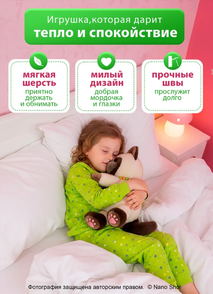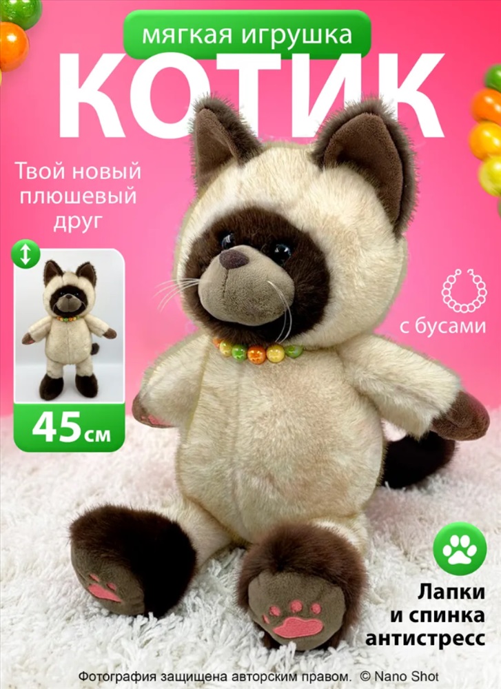 Мягкая игрушка котик с бусами — милый компаньон для дома и уютных обнимашек. Эта мягкая, плюшевая игрушка выглядит как сиамский кот: аккуратная мордочка, нежная окраска и добрые глазки. Мягкая фактура приятна на ощупь, поэтому мягкая игрушка подходит и для детей, и для взрослых: можно играть, укладывать спать, брать в дорогу или просто держать рядом на диване. Бусами украшение добавляет особый шарм — котик сразу смотрится нарядно и фотогенично.