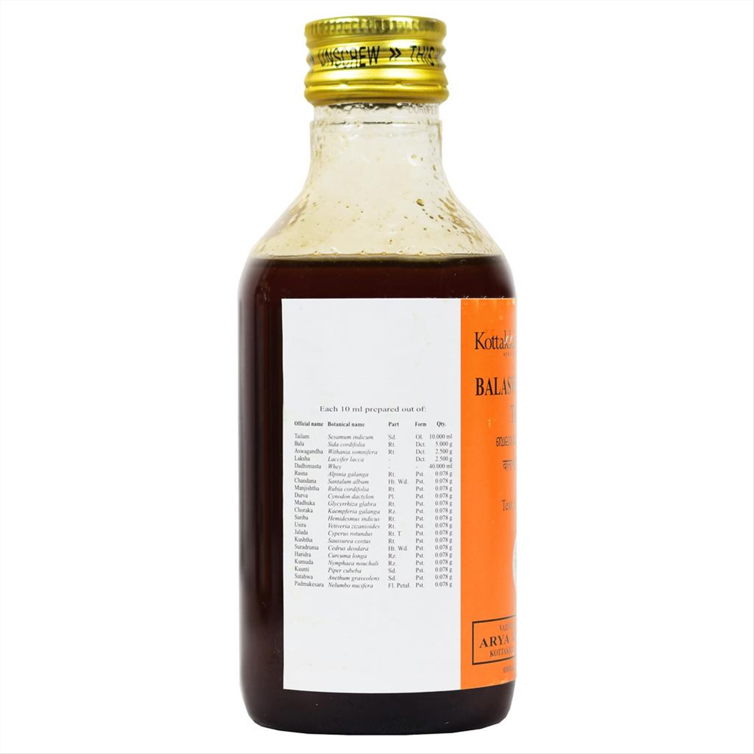 «Баласвагандхади Тайлам» (Balaswagandhadi Tailam) от Kottakkal Ayurveda — аюрведическое масло на основе растительных компонентов. Некоторые показания к применению: преждевременное старение, хроническая усталость, инфекции, отёки, восстановление организма.