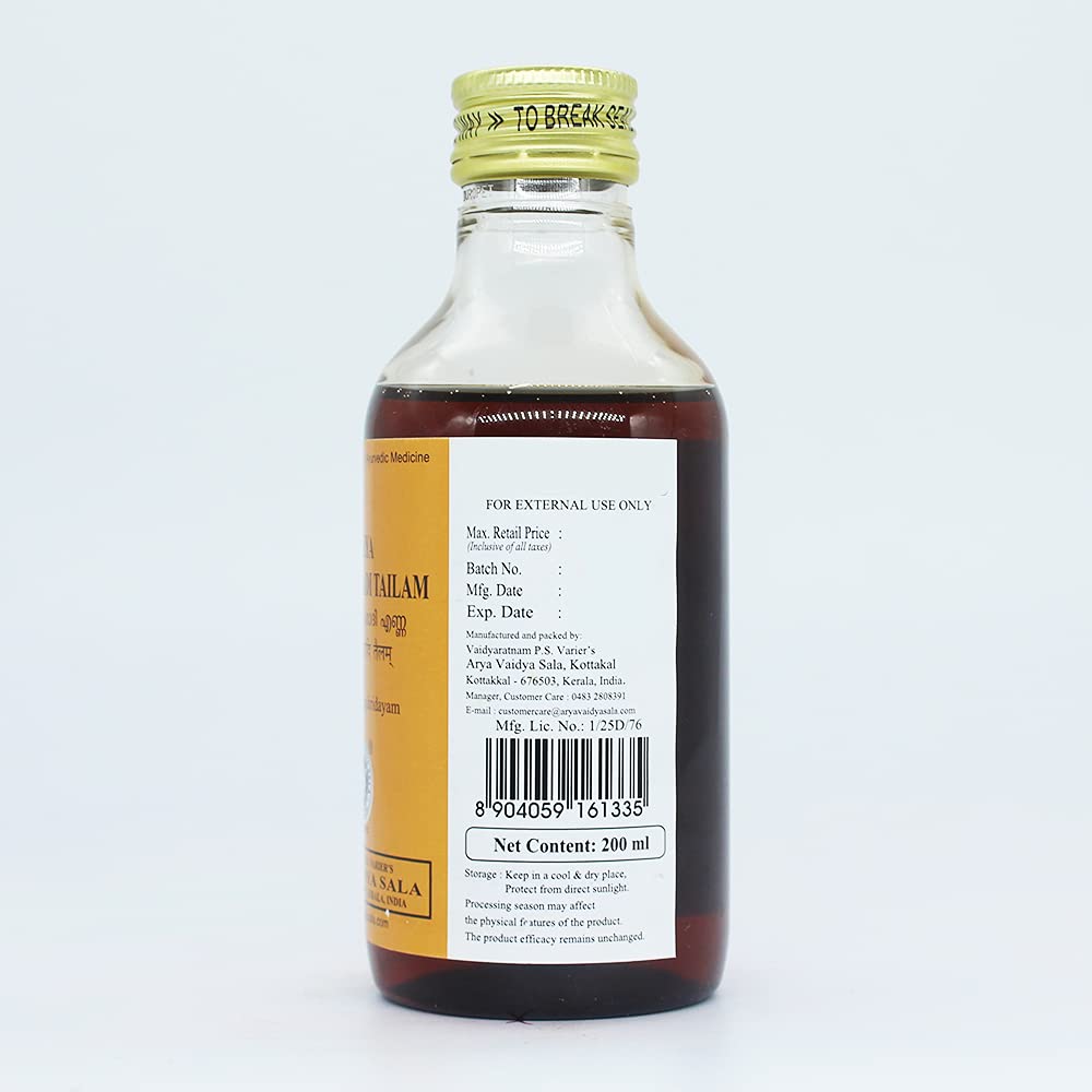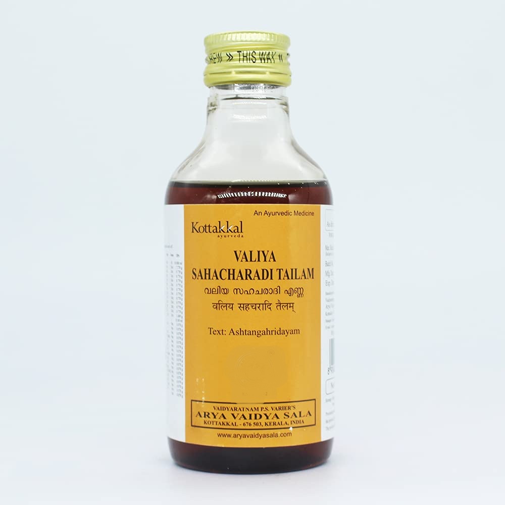 Brand: Kottakal Ayurveda Вес/Объем/ колч: 200 Материал упаковки: PET Мл/уп/г: мл Продается как: шт. Упаковка: Флакон «Валья Сахачаради Тайлам» (Kottakkal Valiya Sahacharadi Tailam) — аюрведическое массажное масло, состоящее из смеси 30 трав, настоянных на молоке, с добавлением кунжутного масла. Показания к применению: заболевания суставов, варикоз и предрасположенность к нему, онемение ног, ревматизм, артрит, артроз, боль в ногах и другие. Комментарии к товару