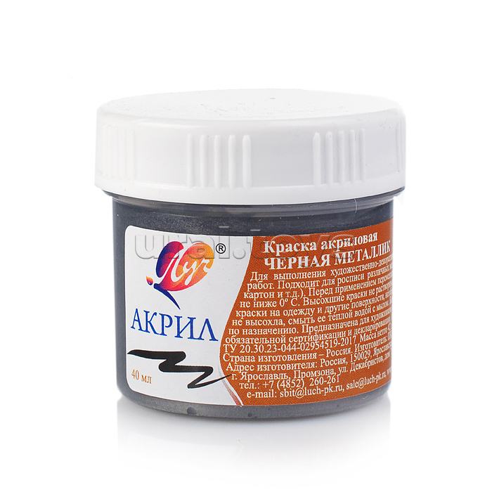 • Предназначена для выполнения художественно-декоративных и оформительских работ. • Подходит для росписи различных материалов ( гипс, глина, стекло, дерево, бумага, картон, керамика). • Имеет ярко выраженный металлический цвет и блеск. • Укрывистая, водоразбавляемая, быстро сохнет на поверхности. • Состав: водная акриловая дисперсия, пигменты, консервант. • Цвет: чёрный металлик. • Объём: 40 мл. • Хранить при температуре не ниже 0 градусов С. • Соответствуют требованиям безопасности продукции. • Для детей от 3-х лет.