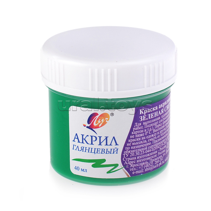 • Предназначена для выполнения художественно-декоративных и оформительских работ. • Подходит для росписи различных материалов ( гипс, глина, стекло, дерево, бумага, картон, керамика). • Имеет насыщенный цвет и глянцевый блеск, хорошо смешивается с другими оттенками. • Укрывистая, водоразбавляемая, быстро сохнет на поверхности. • Состав: водная акриловая дисперсия, пигменты, консервант. • Цвет: зелёная светлая. • Объём: 40 мл. • Хранить при температуре не ниже 0 градусов С. • Соответствуют требованиям безопасности продукции. • Для детей от 3-х лет.