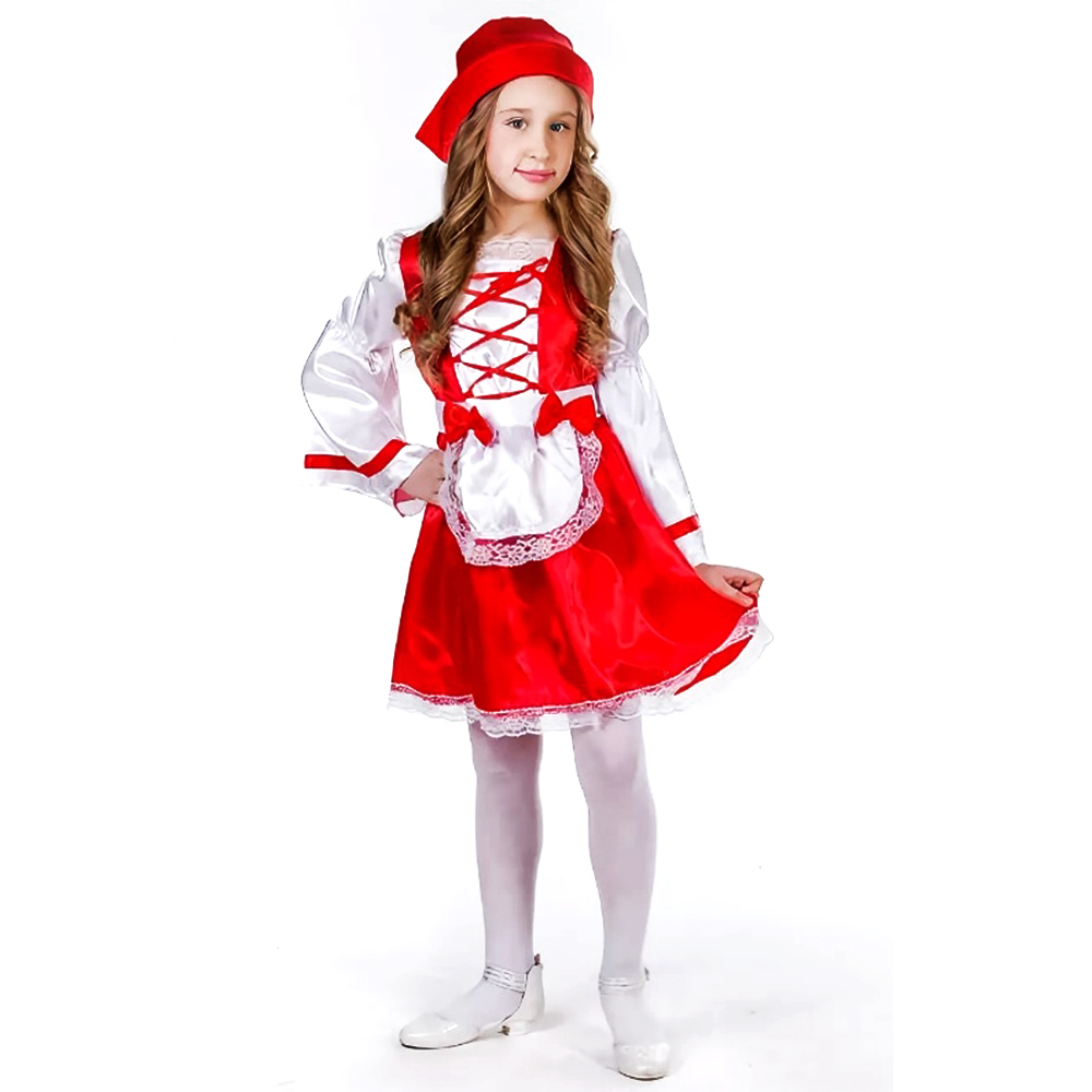 Доп. параметр: Длинный рукав Страна: Беларусь Состав: 100% полиэстер Материал: Иск.шелк Описание и замерыКарнавальный костюм Красная шапочка для девочки, из 3 предметов: платье, шапочка, фартук.Платье отрезное по талии, с корсетной шнуровкой из атласной ленты на полочке. Вырез отделан кружевом. Рукав со сборкой у плеча, присобран на резинке, формирующей фонарик, снизу раклешенный, украшенный полоской из атласной ленты. Застежка молния на спинке. Юбочка по талии присобрана на резинке. Низ юбки украшен кружевом. Шапочка-капор, на подкладе из капрона и синтепона, с отворотом, сзади присобрана на резинке. Фартук на длинном пояске, со складочками у талии. Украшен кружевом и яркими бантиками. Размер 134 Платье: длина 72 см, обхват груди 80 см, длина рукава 42 см. Фартук: длина 23 см, ширина 21 см, длина пояска 106 см. Замеры выборочные, могут незначительно отличаться. Комментарии к товару