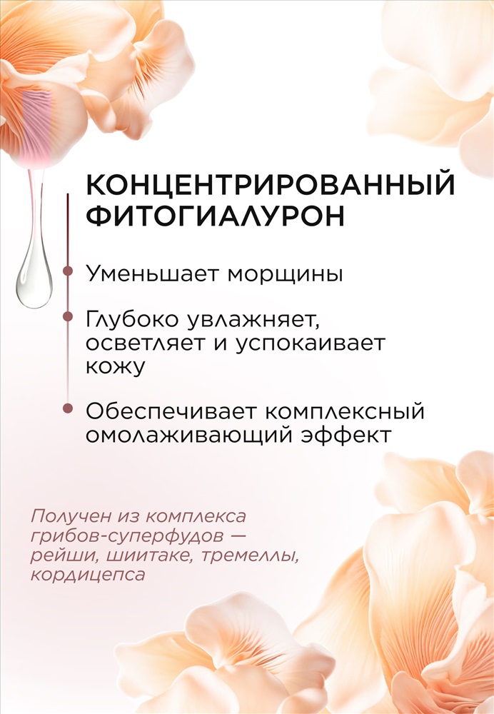Концентрированный фитогиалурон стимулирует синтез коллагена и эластина, осветляет кожу, глубоко увлажняет и успокаивает ее. Получен из комплекса грибов-суперфудов (рейши, шиитаки, тремеллы, кордицепса) и содержит полисахариды, тритерпены, полифенолы, эрготионеин и койевую кислоту, за счет чего обеспечивает комплексный омолаживающий эффект и заметно улучшает состояние кожи.