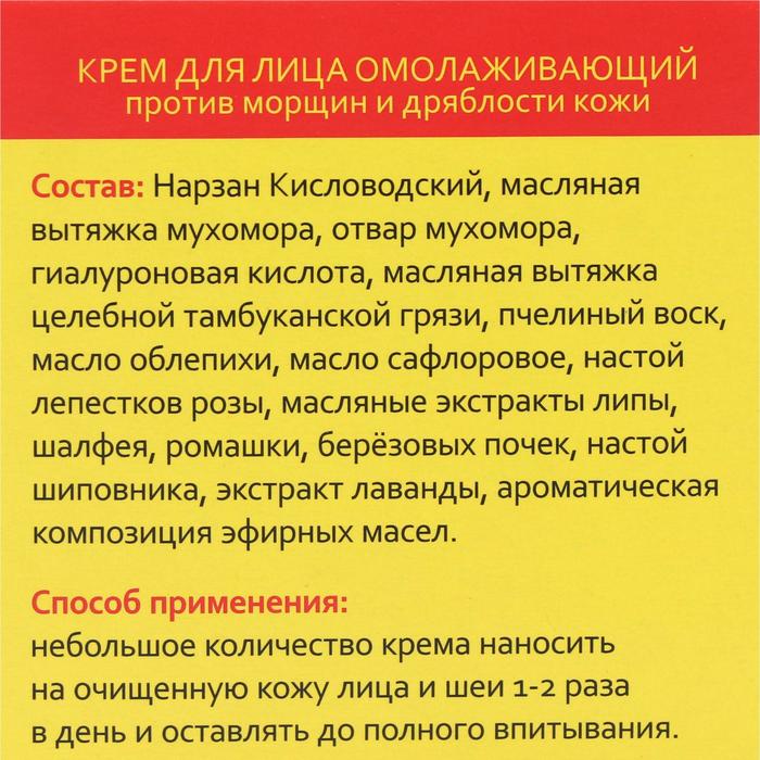 Габариты: 5,5 x 5,5 x 6 Страна: Россия В боксе: 63 шт Состав: См. на упаковке Материалы: см. на упаковке Фасовка: по 1 шт Индивидуальная упаковка: Картонная коробка / упаковка Сертификат: ЕАС Вес, г/Объём, мл: 50 Тип кожи: Зрелая, Для всех типов Возраст: Для всех возрастов Применение: Универсальный Крем для лица «Омолаживающий», основными компонентами которого являются масляная вытяжка из мухомора и экстракты лекарственных растений, зарекомендовавших себя при увядании кожи, может эффективно омолаживать, придавать здоровый вид коже, а также прекрасно стимулировать клеточное обновление и восстановление структур на глубоком уровне. Считается, что натуральные масла в составе интенсивно питают и увлажняют кожу, предотвращают шелушение, тем самым возвращая эластичность и здоровое сияние, замедляя процессы увядания. Крем хорошо подходит для всех типов кожи. Способ применения: небольшое количество крема наносить на очищенную кожу лица и шеи 1-2 раза в день и оставлять до полного впитывания. Состав: нарзан Кисловодский, масляная вытяжка мухомора, отвар мухомора, гиалуроновая кислота, масляная вытяжка целебной тамбуканской грязи, пчелиный воск, масло облепихи, масло сафлоровое, настой лепестков розы, масляные экстракты липы, шалфея, ромашки, берёзовых почек, настой шиповника, экстракт лаванды, ароматическая композиция эфирных масел. Противопоказания: индивидуальная непереносимость компонентов. Комментарии к товару