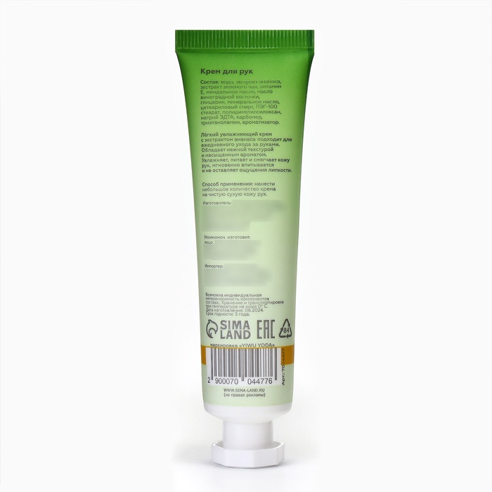 Состав: вода, экстракт зеленого чая, глицерин, минеральное масло, цетеариловый спирт, ПЭГ-100 стеарат, полидиметилсилоксан, натрий ЭДТА, карбомер, триэтаноламин, метилпарабен, пропилпарабен, ароматизатор ананаса.