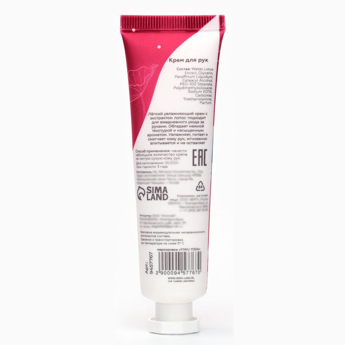 Страна: Китай В боксе: 1000 шт Состав: См. на упаковке Материалы: см. на упаковке Фасовка: по 1 шт Индивидуальная упаковка: Без упаковки Габариты товара: 4 см × 3 см × 11 см Сертификат: ЕАС Вес, г/Объём, мл: 30 Темпер. ограничение НЕ НИЖЕ ℃: 0 Фиксированная цена: Да Лёгкий увлажняющий крем подходит для ежедневного ухода за руками. Обладает нежной текстурой и насыщенным ароматом. Увлажняет, питает и смягчает кожу рук, мгновенно впитывается и не оставляет ощущения липкости. Экстракт лотоса успокаивает кожу, сводя на нет негативные реакции, спровоцированные факторами окружающей среды. Увлажняет кожу, а также удерживает в ней влагу. Дает клеткам импульс к восстановлению и регенерации, делает кожу более эластичной, повышает ее упругость. Способ применения: нанести небольшое количество крема на чистую сухую кожу рук. Состав: вода, экстракт лотоса, гиалуронат натрия, глицерил стеарат, глицерин, пропиленгликоль, минеральное масло, вазелин, бисаболол, феноксиэтанол, гидролизованное касторовое масло, ароматизатор. Комментарии к товару