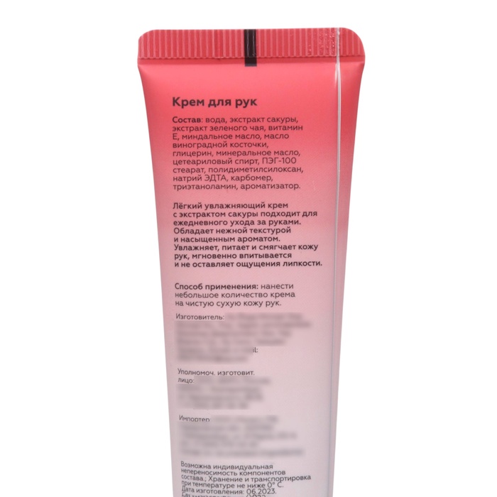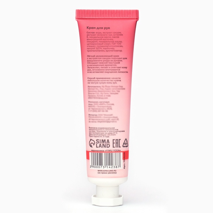 Габариты: 4 x 3 x 11 Страна: Китай В боксе: 1000 шт Состав: См. на упаковке Материалы: см. на упаковке Фасовка: по 1 шт Индивидуальная упаковка: Без упаковки Габариты товара: 4 см × 3 см × 11 см Сертификат: ЕАС Вес, г/Объём, мл: 30 Темпер. ограничение НЕ НИЖЕ ℃: 0 Сакура – ценнейший источник антиоксидантов, жизненно важных витаминов и минералов, дубильных веществ и органических кислот. Экстракт сакуры содержит каротин и аскорбиновую кислоту, витамины группы В, включая фолиевую кислоту, а также медь, железо, магний, калий, пектины, лимонную и яблочную кислоты. Благодаря своему составу, экстракт сакуры обладает выраженным положительным действием на состояние кожи рук, сильным противомикробным и противовоспалительным действием. Способ применения: нанести небольшое количество крема на чистую сухую кожу рук. Состав: Water, Glycerin, Petrolatum, Caprylic/Capric Triglyceride, Stearic Acid, Ethylhexyl Palmitate, Dimethicone, Carbomer, Triethanolamine, Prunus Serrulata, Niacinamide, Lac, Sodium Hyaluronate, Benzaldehyde, Acetophenone, Allantoin, EDTA, Fragrance. Комментарии к товару