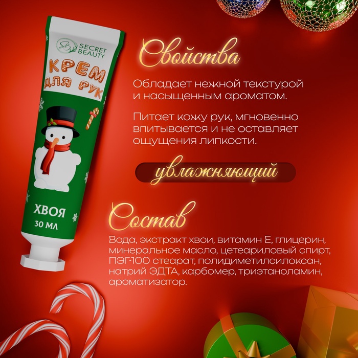 Габариты: 2 x 2 x 12 Страна: Китай В боксе: 1000 шт Фасовка: по 1 шт Индивидуальная упаковка: Без упаковки Сертификат: ЕАС Вес, г/Объём, мл: 30 Тематика праздника: Новый год, Рождество Новогодний увлажняющий крем для рук с ароматом хвои, 30 мл — это идеальный уход за кожей в зимний период и прекрасное дополнение к праздничным подаркам. В холодное время года кожа рук особенно подвержена воздействию низких температур и сухого воздуха, что может вызывать сухость и шелушение. Этот крем интенсивно увлажняет и защищает кожу, сохраняя её мягкость и эластичность. Лёгкая текстура крема быстро впитывается, не оставляя липкости, и создаёт комфортное ощущение увлажнённости. Аромат хвои добавляет приятные ноты к уходу, погружая в атмосферу уюта и праздника. Компактный размер тюбика удобно носить с собой, чтобы всегда иметь возможность заботиться о своих руках. Праздничная упаковка делают этот крем отличным выбором для подарков друзьям, коллегам или близким, такой презент порадует каждого. Комментарии к товару