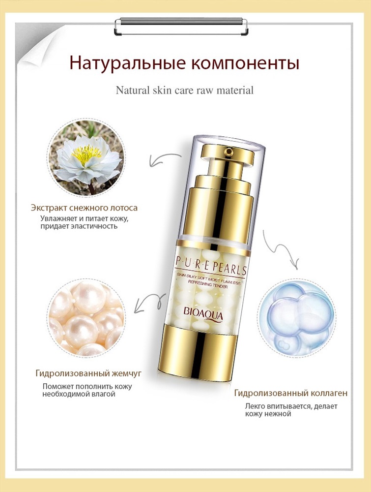 Крем для век с жемчугом Bioaqua 25 граммПредлагаем попробовать новый крем с жемчугом «Биоаква» для век, изготовленный на основе экстракта жемчужины. Сделан он по уникальной формуле, улучшающей внешний вид и состояние кожи в короткие сроки. Средство обладает хорошей консистенцией – представляет собой крем-гель, так что отличается удобством использования и быстротой впитывания. С помощью этого товара женщины добьются: 1. Глубокого увлажнения – каждая кожная клетка получить необходимое количество воды. 2. Расслабления кожи – дерма получает нужный уход, за счет чего снова становится «свежей» и красивой. 3. Исчезновения морщин – небольшие морщинки, которые появляются с возрастом, больше не проблема. 4. Чистой кожи – неэстетичные участки и «мешки» под глазами уже скоро исчезнут с лица. Если вы хотите, чтобы кожа век была красивой, получила сияющий эффект, это подходящий выбор. Способ применения: 1) Взять необходимое количество крема на палец и аккуратно нанести на веки вдоль текстуры кожи круговыми движениями; 2) Массировать веки для лучшего впитывания крема. Комментарии к товару