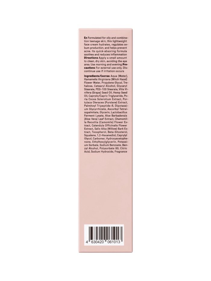 Габариты: 17 x 4 x 3,5 Страна: Россия В боксе: 81 шт Состав: См. на упаковке Материалы: см. на упаковке Фасовка: по 1 шт Индивидуальная упаковка: Без упаковки Сертификат: ЕАС Вес, г/Объём, мл: 65 Темпер. ограничение НЕ НИЖЕ ℃: 0 Тип кожи: Для всех типов Возраст: Для всех возрастов Применение: Универсальный Крем для ежедневного ухода за подростковой кожей Лёгкий крем разработан специально для потребностей подростковой кожи. Он быстро впитывается, не утяжеляет и помогает регулировать выработку кожного себума, снижая жирный блеск. Формула направлена на уменьшение воспалений и покраснений, способствует успокоению кожи и поддерживает её комфортное состояние в течение дня. Активные компоненты обеспечивают необходимое увлажнение, помогают выровнять тон кожи и поддерживают её защитные функции. Крем подходит для ежедневного использования и помогает сохранить кожу мягкой, свежей и ухоженной. Способ применения: Нанесите небольшое количество крема на чистую и сухую кожу лица, избегая области вокруг глаз. Используйте утром и вечером. Состав: Вода, гидролат гамамелиса, пропиленгликоль, трегалоза, цетеариловый спирт, глицерил стеарат, ПЭГ-100 стеарат, масло виноградной косточки, масло конопляное, каприлик/каприл триглицерид, экстракт пории кокосовидной, экстракт портулака, пальмитоил трипептид-8, дикалий глицирризинат, аскорбил тетраизопальмитат, глицерин, лизат лактобактерий, экстракт алоэ вера, экстракт ромашки, экстракт календулы, экстракт коры ивы, токоферол, бета-ситостерол, сквален, 1,2-гександиол, каприлилгликоль, карбомер, гидроксиацетофенон, этилгексилглицерин, сорбат калия, бензоат натрия, бензиловый спирт, полисорбат-80, лимонная кислота, гидроксид натрия, отдушка. Комментарии к товару