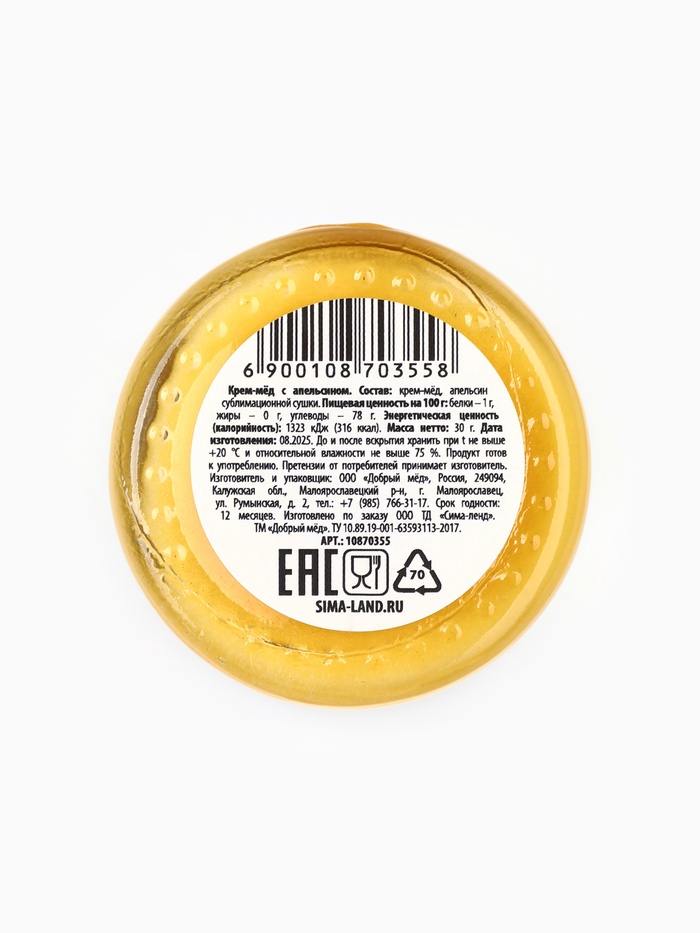 Габариты: 4,5 x 4,5 x 3,5 Страна: Россия В боксе: 100 шт Состав: См. на упаковке Материалы: см. на упаковке Фасовка: по 1 шт Индивидуальная упаковка: Без упаковки Сертификат: ЕАС Набор: Нет Вес нетто, г: 30 Символ года: Нет Тематика праздника: Новый год Вкус: Апельсин Вид: Крем-мёд Добавки: Апельсин ПРИ ОФОРМЛЕНИИ ЗАКАЗА, ПРОСИМ ЗАПРАШИВАТЬ АКТУАЛЬНЫЕ СРОКИ ГОДНОСТИ У МЕНЕДЖЕРА Крем-мёд с апельсином. Состав: крем-мёд, апельсин сублимационной сушки. Пищевая ценность на 100 г: белки – 1 г, жиры – 0 г, углеводы – 78 г. Энергетическая ценность (калорийность): 1323 кДж (316 ккал). Комментарии к товару