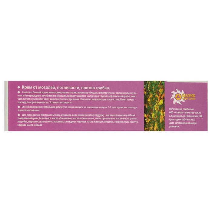 Габариты: 3,5 x 13,5 x 3,5 Страна: Россия В боксе: 80 шт Состав: См. на упаковке Материалы: см. на упаковке Фасовка: по 1 шт Индивидуальная упаковка: Картонная коробка / упаковка Сертификат: ЕАС Вес, г/Объём, мл: 30 Назначение: Для пяток и стоп, Для лечения заболеваний кожи Темпер. ограничение НЕ НИЖЕ ℃: 0 Крем ухаживает за кожей, размягчает мозоли, способствует заживлению царапин и трещин. Средство успокаивает и увлажняет эпидермис, устраняет раздражения и шелушения. Обладает антисептическим и дезодорирующим эффектом, обеспечивает профилактику возникновения грибковых поражений. Регулярное использование крема снижает потливость ног. Средство может применяться также на других участках тела, которые отличаются повышенной потливостью. Способ применения: небольшое количество крема 1–2 раза в сутки наносите тонким слоем на чистую сухую кожу ног или других частей тела. Оставьте до полного впитывания. Максимальный эффект достигается после 2 недель регулярного применения крема. Состав: масляная вытяжка мухомора, вода горной реки Уллу-Муруджу , масляная вытяжка целебной тамбуканской грязи, белый воск, масло облепиховое, масло прополисное, масляные экстракты зверобоя, морозника кавказского, маклюры, календулы, лавровое масло, живица кавказская, эфирное масло каяпута, эфирное масло сандала. Комментарии к товару