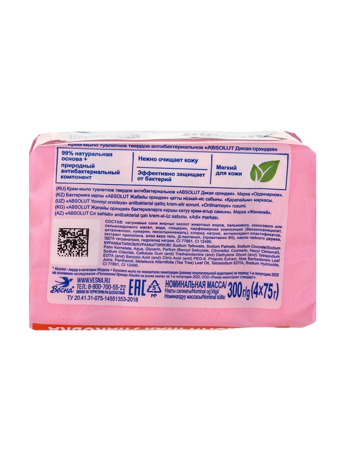 Крем-мыло Absolut «Дикая орхидея» сочетает в себе эффективную антибактериальную защиту и бережный уход за кожей. Его специально разработанная формула обеспечивает тщательное очищение, уничтожая до 99,9 % бактерий, при этом не нарушает естественный баланс кожи и поддерживает ощущение мягкости и комфорта.