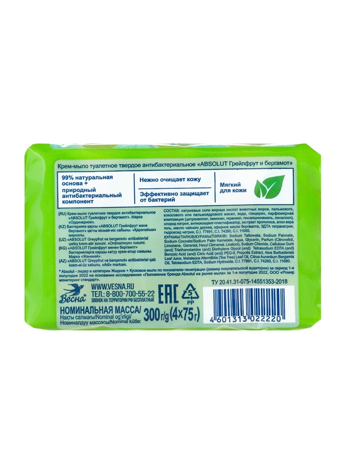 Крем-мыло Absolut «Грейпфрут и бергамот» сочетает надёжную антибактериальную защиту с мягким уходом и приятным цитрусовым ароматом. Благодаря сбалансированной формуле мыло эффективно очищает кожу, удаляя загрязнения и до 99,9% бактерий, при этом сохраняет естественный уровень увлажнённости и не вызывает сухости.