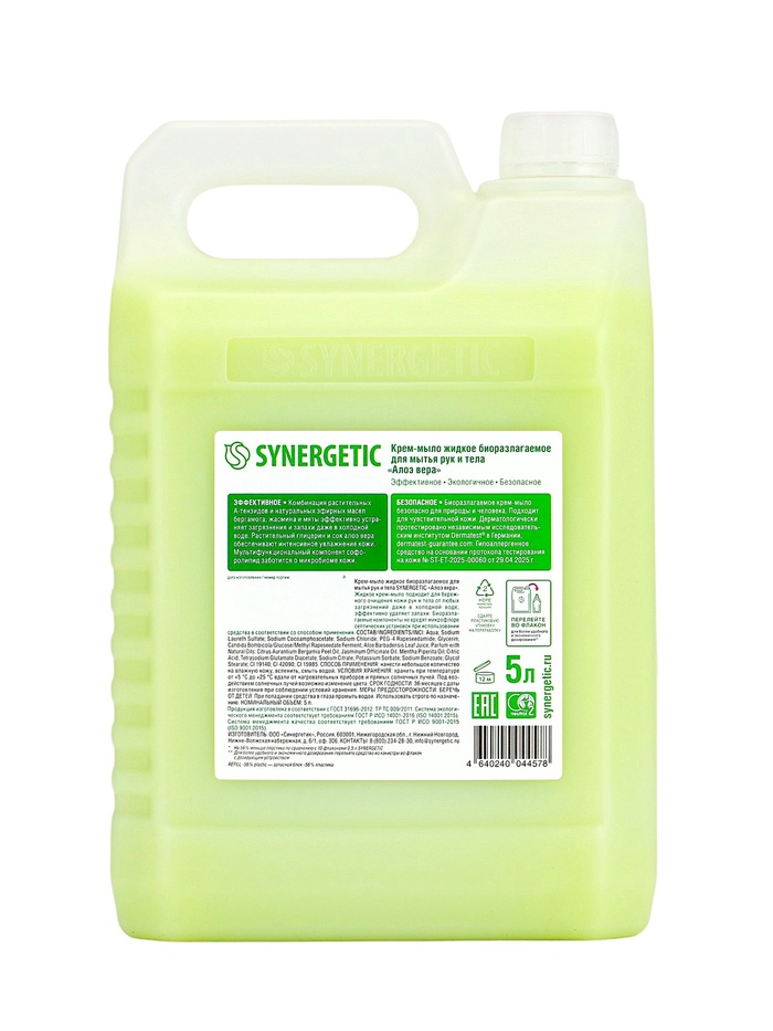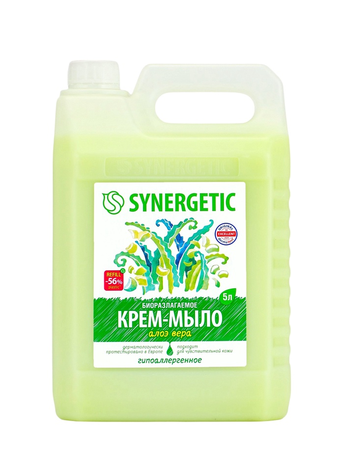 Габариты: 18,5 x 13,5 x 28 Доставка: Платная Страна: Россия В боксе: 4 шт Состав: См. на упаковке Материалы: см. на упаковке Фасовка: по 1 шт Индивидуальная упаковка: Без упаковки Сертификат: ЕАС Набор: Нет Вес, г/Объём, мл: 5000 Вид упаковки: Пластиковая бутылка Область применения: Для рук, Для тела Аромат: Алоэ вера Тип: Жидкое Вид мыла: Крем-мыло Крем-мыло SYNERGETIC "Алоэ вера" — это экологичное средство для бережного ухода за кожей рук и тела. Формула на основе растительных компонентов эффективно очищает, не пересушивая и сохраняя естественный баланс влаги. Экстракт алоэ вера интенсивно увлажняет, смягчает и успокаивает кожу, придавая ей ощущение свежести и комфорта после каждого применения. Средство полностью биоразлагаемое, безопасное для человека и окружающей среды, не содержит агрессивных компонентов и подходит для всей семьи. Большой объём 5 л обеспечивает экономичный расход и удобство для регулярного использования дома или в общественных помещениях. Способ применения