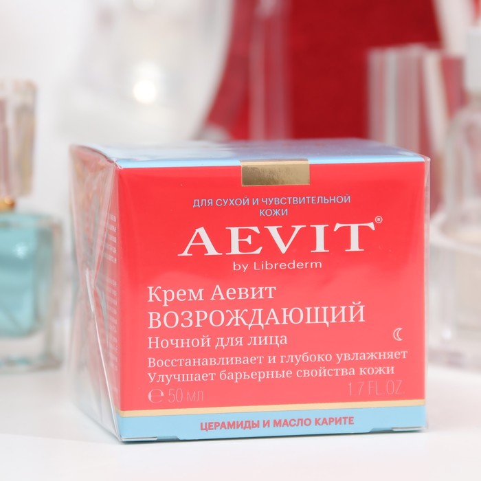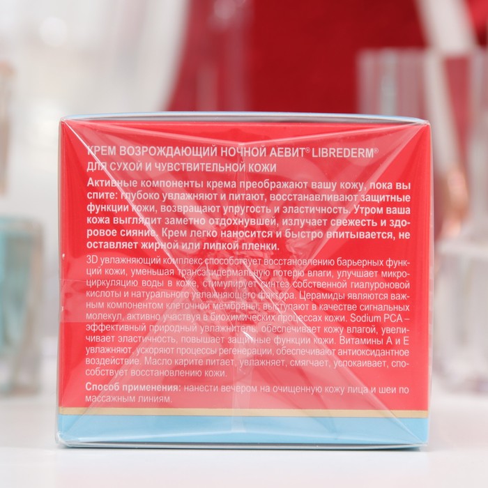 Габариты: 7 x 7 x 6,5 Страна: Россия В боксе: 18 шт Состав: См. на упаковке Материалы: см. на упаковке Фасовка: по 1 шт Индивидуальная упаковка: Цветная картонная коробка Сертификат: ЕАС Вес, г/Объём, мл: 50 Темпер. ограничение НЕ НИЖЕ ℃: 0 Тип кожи: Для всех типов Возраст: Для всех возрастов Применение: Ночной Фиксированная цена: Да Крем возрождающий ночной АЕВИТ преображает кожу во время сна: глубоко увлажняет и питает, восстанавливает защитные функции, возвращает упругость и эластичность. Нежная текстура крема легко наносится и быстро впитывается, не оставляя жирной пленки. Подходит для сухой и чувствительной кожи лица. 3D-увлажняющий комплекс в сочетании с церамидами способствует восстановлению барьерных функций кожи, уменьшая потерю влаги, стимулирует синтез собственной гиалуроновой кислоты и натурального увлажняющего фактора (NMF). Sodium PCA, эффективный природный увлажнитель, увеличивает эластичность, повышает защитные функции кожи, ускоряет клеточный обмен веществ. Витамины А и Е эффективно увлажняют, ускоряют процессы регенерации, обеспечивают антиоксидантное воздействие Масло карите питает, увлажняет, смягчает, успокаивает кожу, способствует ее восстановлению. Способ применения: нанести вечером на очищенную кожу лица и шеи по массажным линиям. Состав: aqua, ethylhexyl stearate, glycerin, polyglyceryl-3 methylglucose distearate, isostearyl isostearate, caprylic/capric triglyceride, sodium acrylates copolymer, butyrospermum parkii butter, cyclopentasiloxane, xylitylglucoside, cetyl alcohol, prunus amygdalus dulcis oil, sesamum indicum oil, anhydroxylitol, lecithin, xylitol, potassium cetyl phosphate, behenic acid, cetyl behenate, tocopheryl acetate, sodium pca, retinyl palmitate, sodium lauroyl lactylate, ceramide np, squalene, ceramid ap, phytosphingosine, cholesterol,ceramid eop, beta-sitosterol, carbomer, xanthan gum, parfum, tocopherol (mixed), phenoxyethanol, ethylhexylglycerin, chlorphenesin, disodium edta, geraniol, hexyl cinnamal, hydroxycitronellal, citronellol, linalool, benzyl benzoate, limonene, coumarin, alpha-isomethyl ionone, cinnamyl alcohol. Комментарии к товару