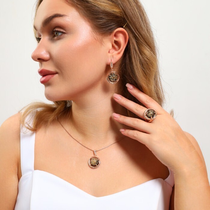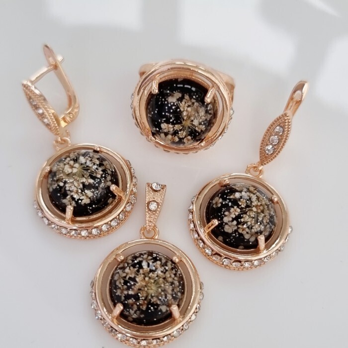 Крупный комплект ювелирной бижутерии коллекция "Дубай" серьги, кулон и кольцо 19 р, покрытие: позолота вставка: фианиты, искусственный камень, сухоцветы, цвет: прозрачный и черный, арт.213.883-19