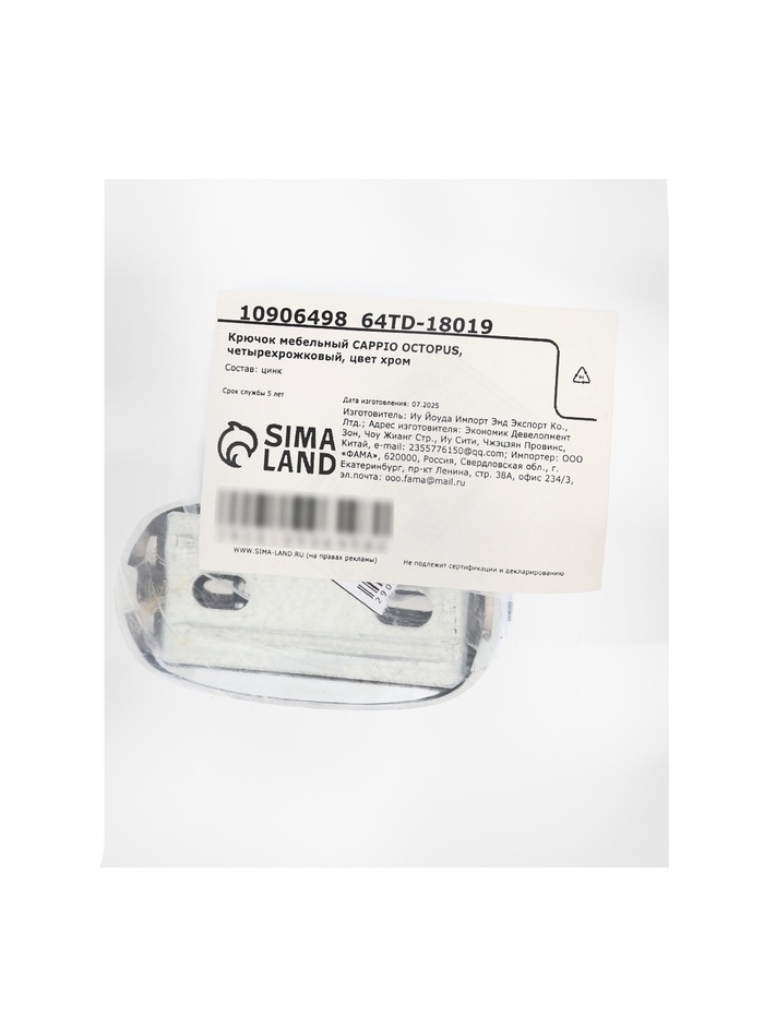 Габариты: 6 x 7 x 2 Страна: Китай В боксе: 150 шт Состав: Цинк Материалы: цинк Фасовка: по 15 шт Индивидуальная упаковка: Пакет Габариты товара: 6,4 см × 6,6 см × 2 см Сертификат: Не подлежит сертификации Количество рожков: 4 Гарантийный срок, мес.: 6 Материал: Цинковый сплав Цвет: Хром Комментарии к товару
