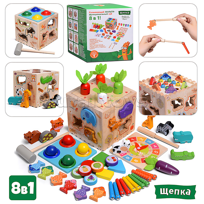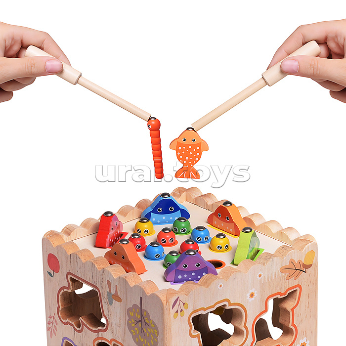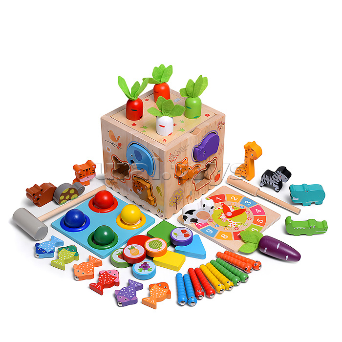 • Размеры игрушки: 13х13х13 см. • 8 вариантов игры: - Магнитная рыбалка "Шустрые рыбки" - Сортер "Фрукты" - Стучалка "Цветные шарики" - Сортер "Животные" - Пазл-вкладыш "Цветные фигуры" - Магнитная рыбалка "Забавные червячки" - Часы "Изучаем время" - Сортер "Спелые морковки" • Материал: дерево. • Соответствует требованиям безопасности продукции. • Для детей от 3-х лет.