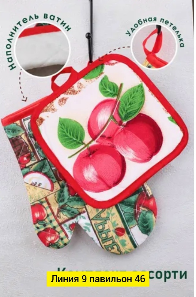 Универсальный кухонный набор прихватка и варежка идеально подойдет для подарка хозяйке! Его можно использовать для безопасной работы с горячей посудой, а так же как декоративное украшение Вашей кухни. Состав: 50% хлопок, 50% полиэстер. Расцветки в ассортименте.