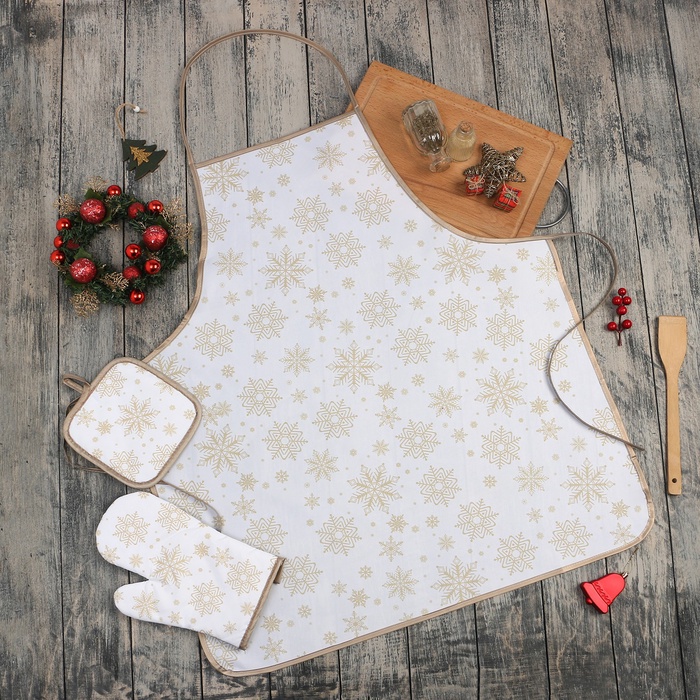 Производитель: Доляна Габариты: 29 x 18 x 2 Страна: Китай В боксе: 125 набор Состав: Полиэстер 100% Материалы: полиэстер Фасовка: по 1 набор Сертификат: ЕАС Набор: Да Цвет: Золотистый, Белый Для кого: Унисекс Ткань: Полиэстер Размер, см: 70 х 80, 17 х 17, 26 х 16 В наборе, шт.: 3 Тематика: Зима Вид упаковки: Пакет Тематика праздника: Новый год Адресат: Без адресата Декоративные элементы: Без элементов Рекомендации по уходу: Глажка запрещена, Не отбеливать, Деликатная стирка при 30 °С Состав ткани: Полиэстер Составляющие набора: Варежка-прихватка, Прихватка, Фартук Возраст: Для взрослых Фиксированная цена: Да