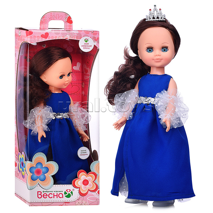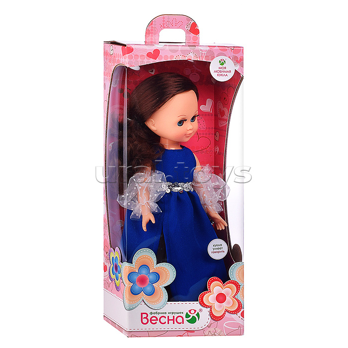 Размер: 35 см. Подвижные руки и ноги. Вставные закрывающиеся глаза. Кукла озвучена, говорит несколько фраз (до 8 фраз). У куклы длинные мягкие волосы, прошитые по всей голове. Материал: текстиль, полимерные материалы. Соответствует требованиям безопасности продукции. Для детей от 3 лет.