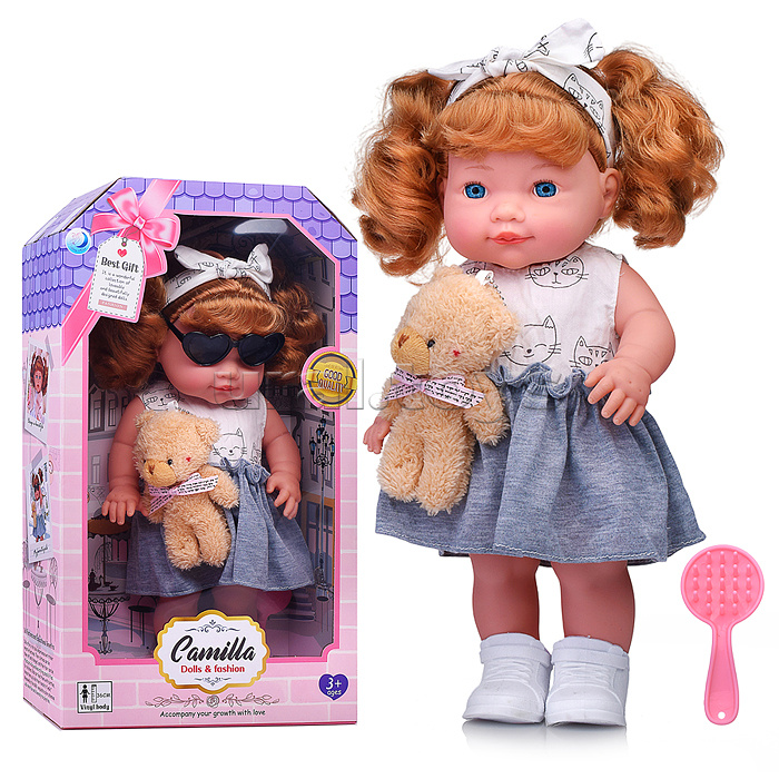 Высота куклы: 36 см. Воспроизводит детские звуки (мама, папа, смеётся, плачет) при нажатии на звуковой модуль, расположенный в спине. Для работы звукового модуля используются 3 батарейки типа AG13 (в комплекте демонстрационные). Тело из пластика, руки ноги и голова из ПВХ. Соответствует требованиям безопасности продукции. Для детей от 3-х лет.