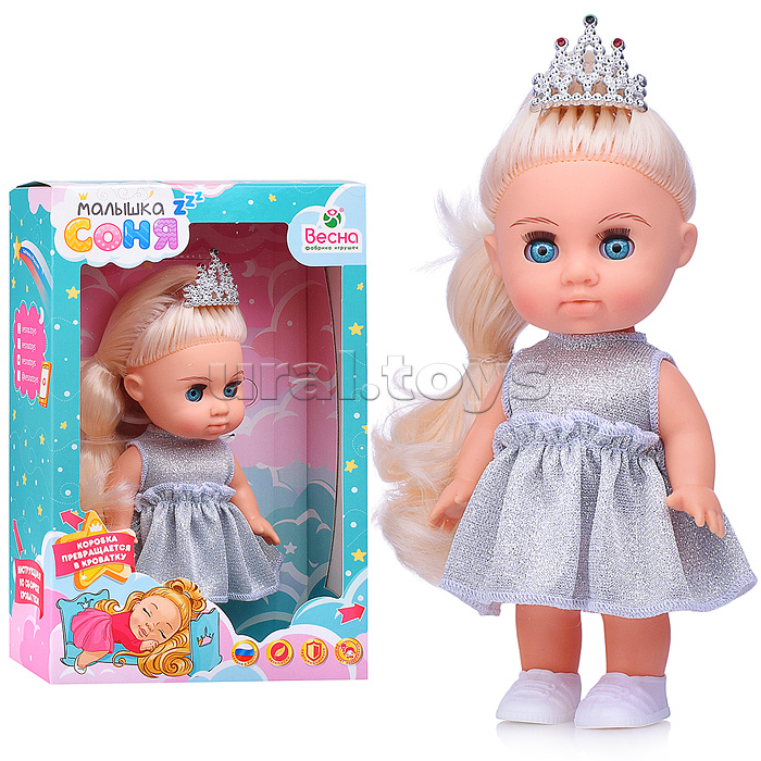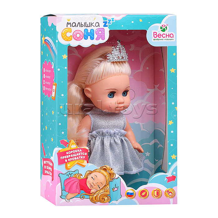 Код: 490062 Страна производитель: Россия Размеры упаковки: 18 x 28 x 8 см Количество в коробке: 6 Рост куклы: 20 см. Подвижные руки и ноги. Вставные закрывающиеся глаза. Коробка превращается в кроватку. У куклы длинные мягкие волосы, прошитые по всей голове. Для детей от 3-х лет. Комментарии к товару