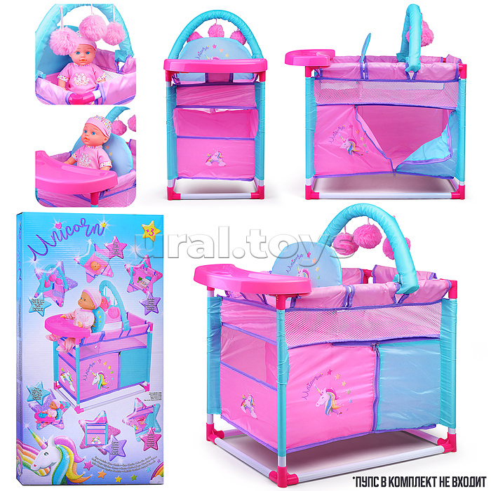 Размеры: 56 х 32 х 41 см. - пластиковый столик для кормления пупса - 3 мягкие подвесные игрушки Подходит для кукол высотой до 35 см. Стальной каркас. Соответствует требованиям безопасности продукции. Для детей от 3-х лет.