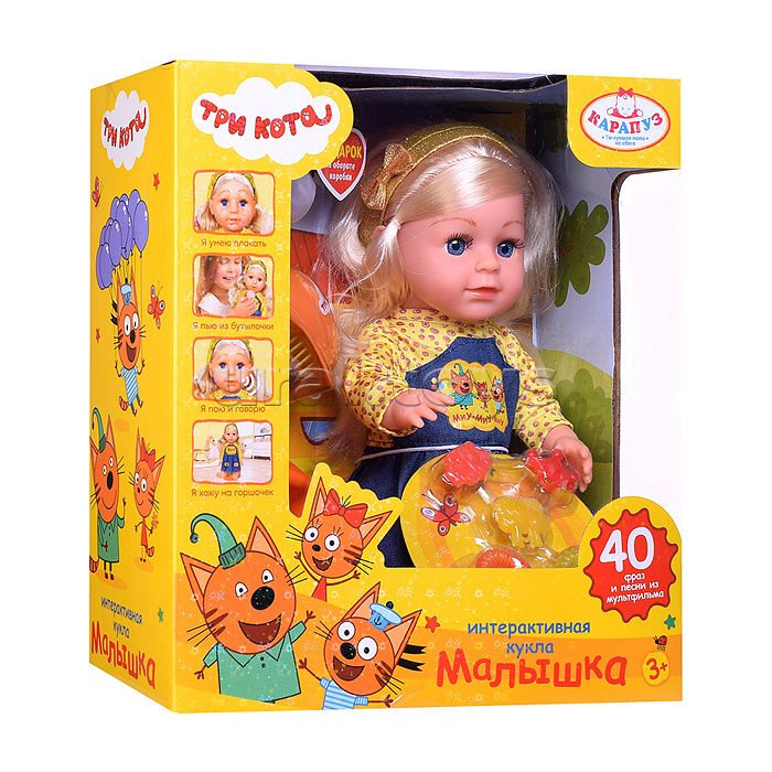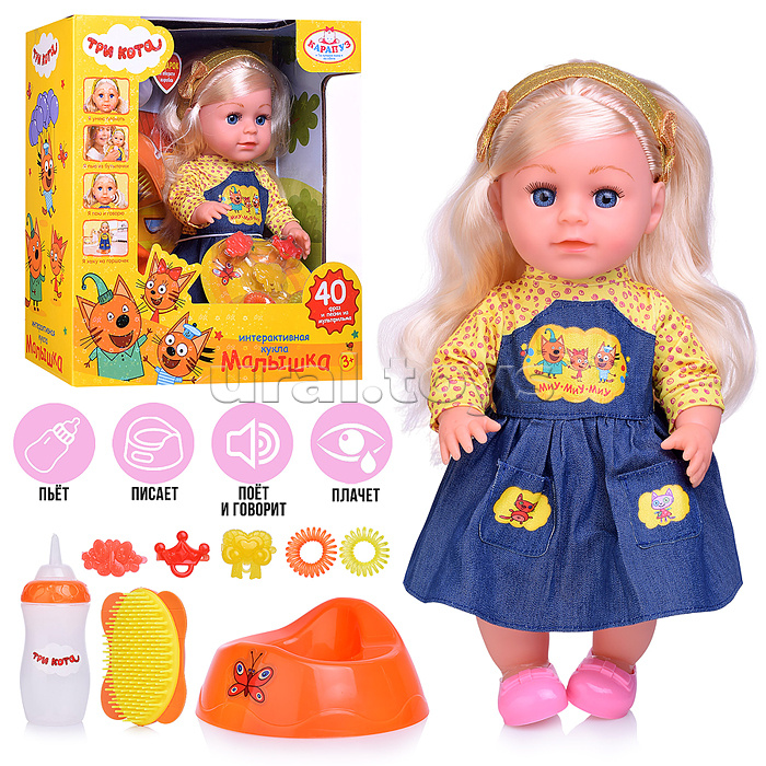 Код: 510467 Штрихкод: 4650250508632 Страна производитель: Китай Размеры упаковки: 28 x 15 x 31 см Количество в коробке: 12 • Высота пупса: 30 см. • Подвижные руки и ноги. • Функции: - пьёт из бутылочки. - ходит на горшок. - 8 отрывков песен из мультфильмов. • Звук работает от 2-х батареек "АА" (входят в комплект для демонстрации) • Материалы пупса: пластик, ПВХ, текстиль. • В комплекте: бутылочка, горшок, расчёска, заколки. • Соответствует требованиям безопасности продукции. • Для детей с 3-х лет. Комментарии к товару