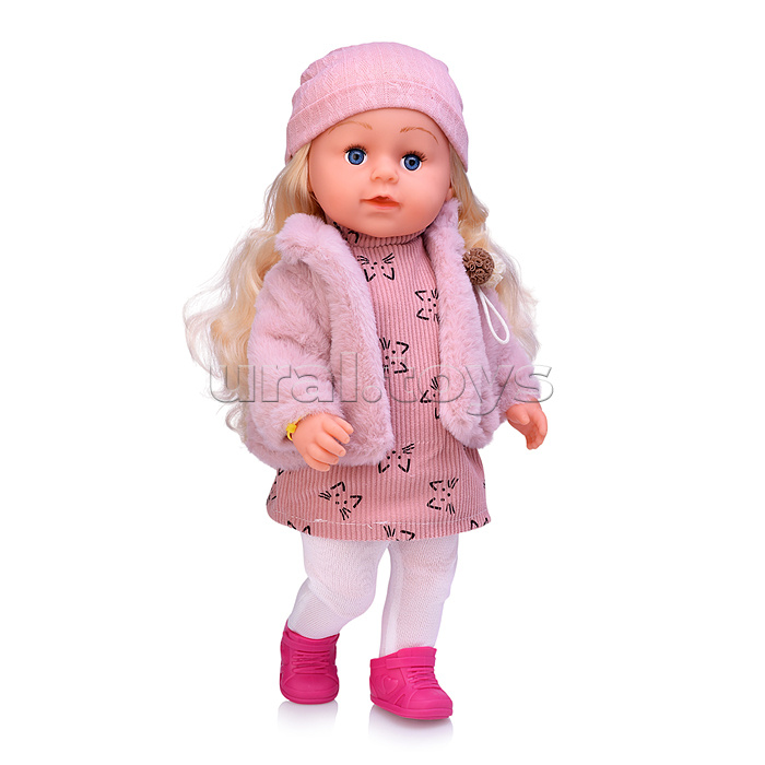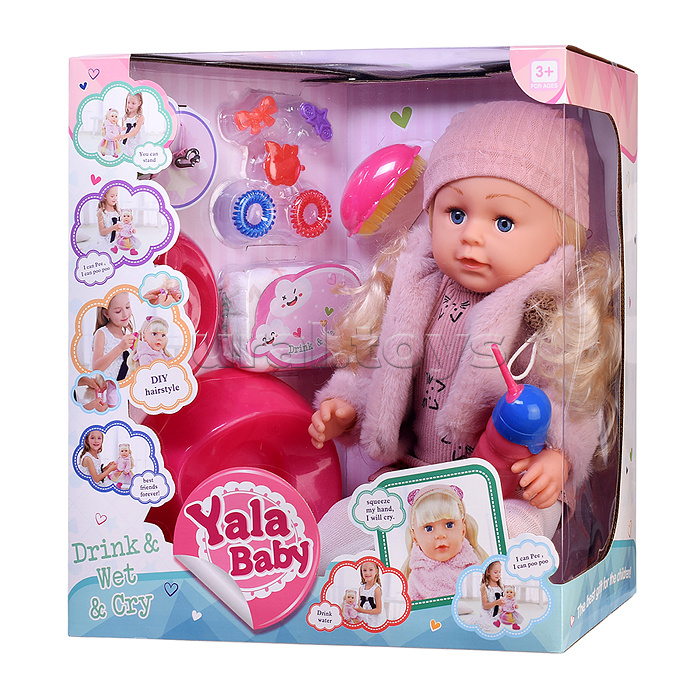• Высота пупса: 45 см. • Подвижные руки и ноги. • Функции: - пьёт из бутылочки. - ходит на горшок. - катятся слезы. • Материал пупса: полимерные материалы, текстиль. • В комплекте: бутылочка, горшок, соска, памперс, тарелочка с ложечкой, расческа. • Соответствует требованиям безопасности продукции. • Для детей с 3-х лет.