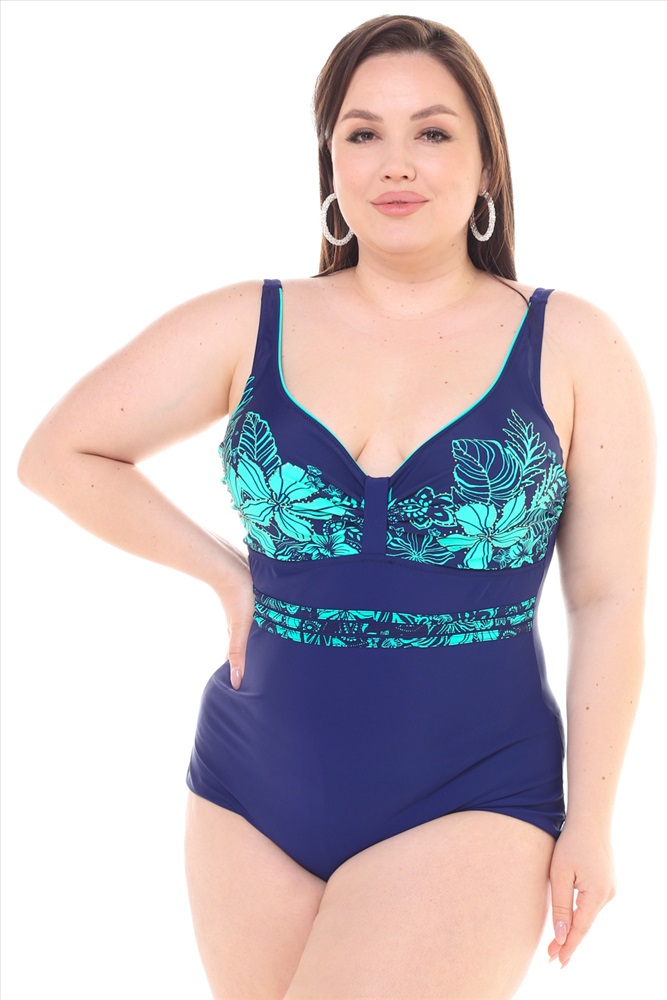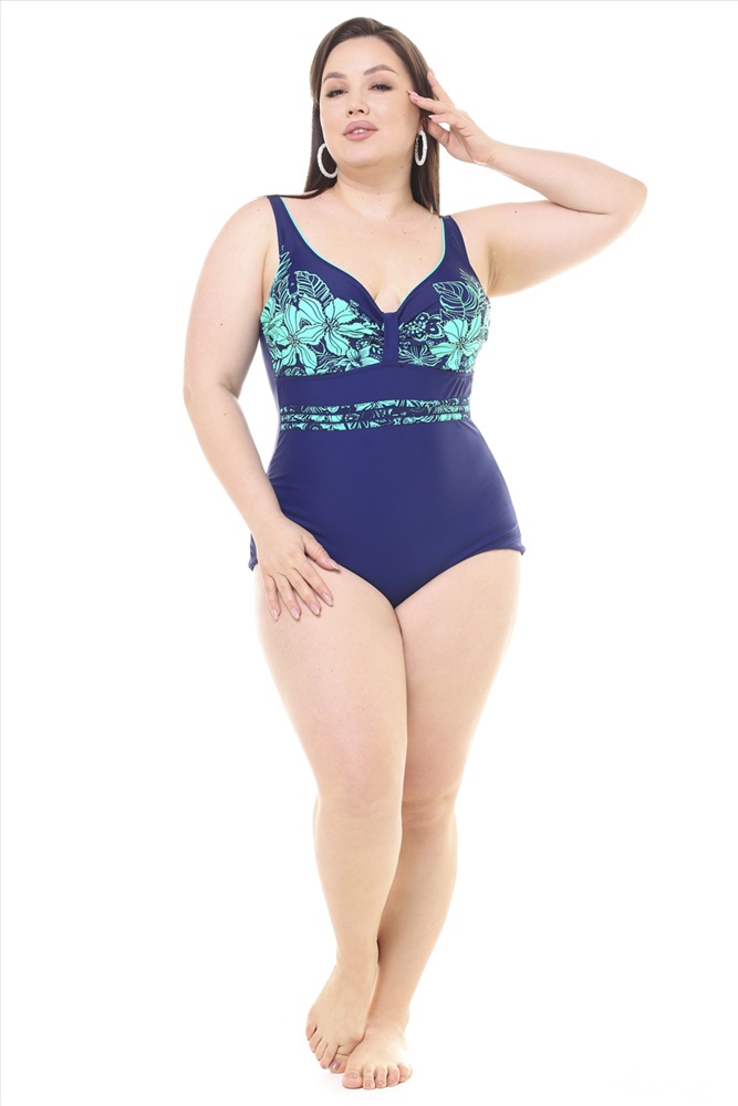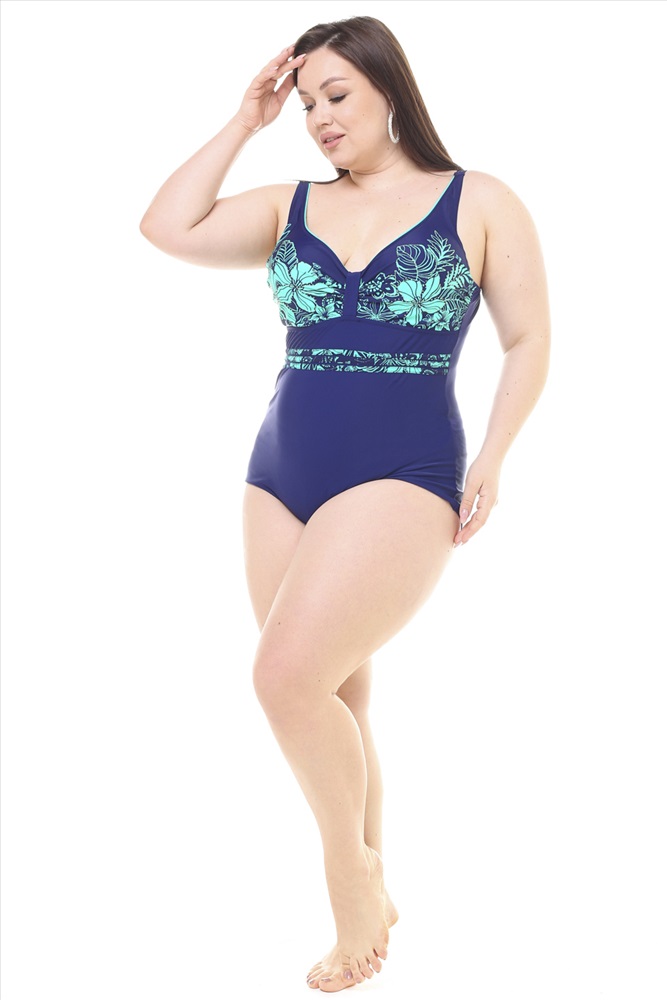Купальник цельный с бирюзовыми цветами с полосками синий