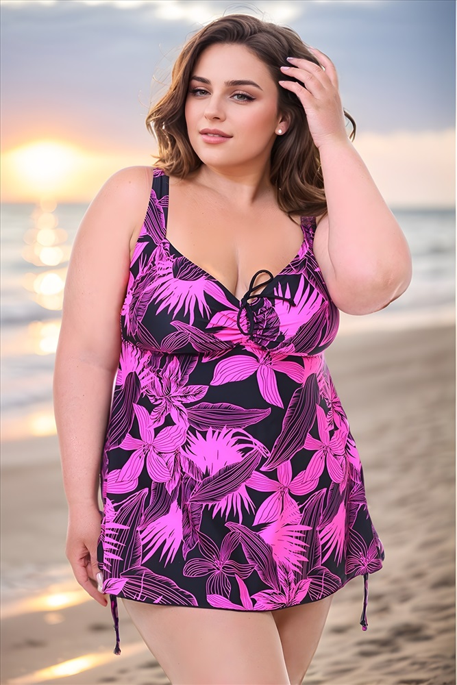 Купальник-платье "крупный цветочный принт" розовый с черным