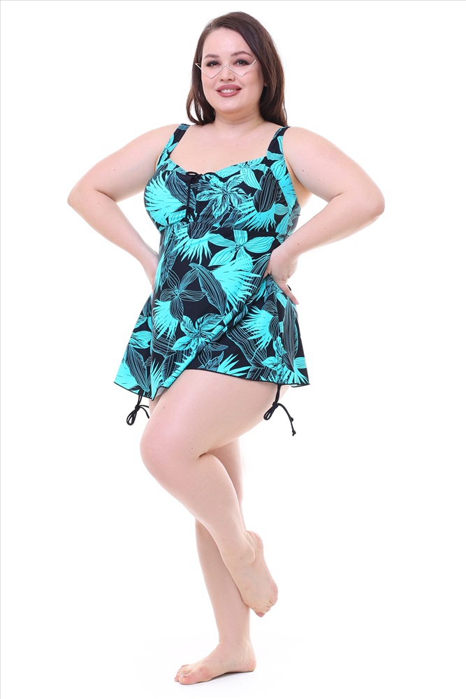 Купальник-платье "крупный цветочный принт" бирюза с черным