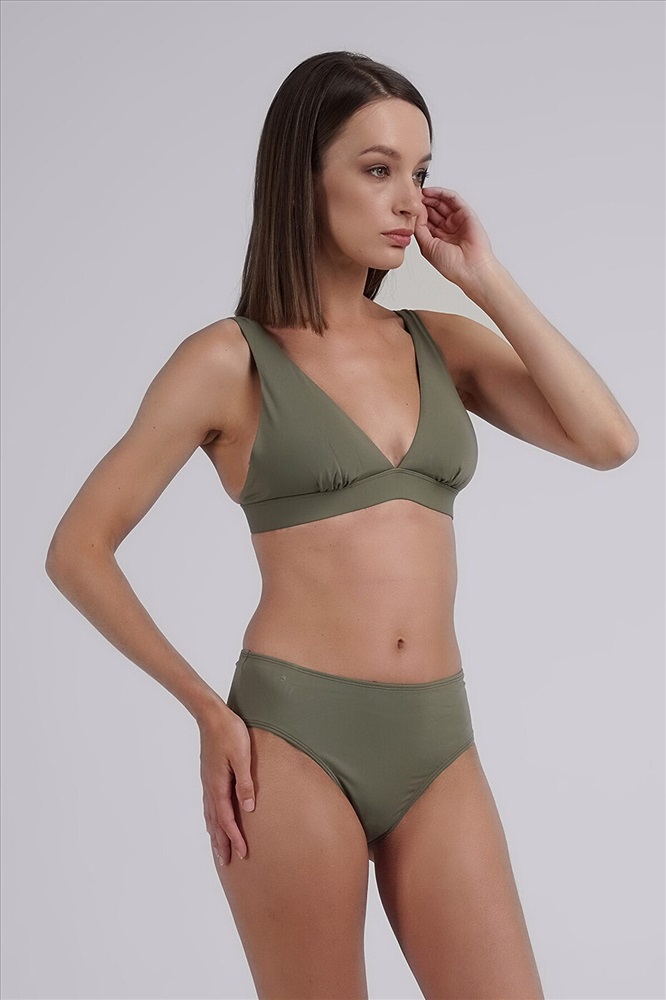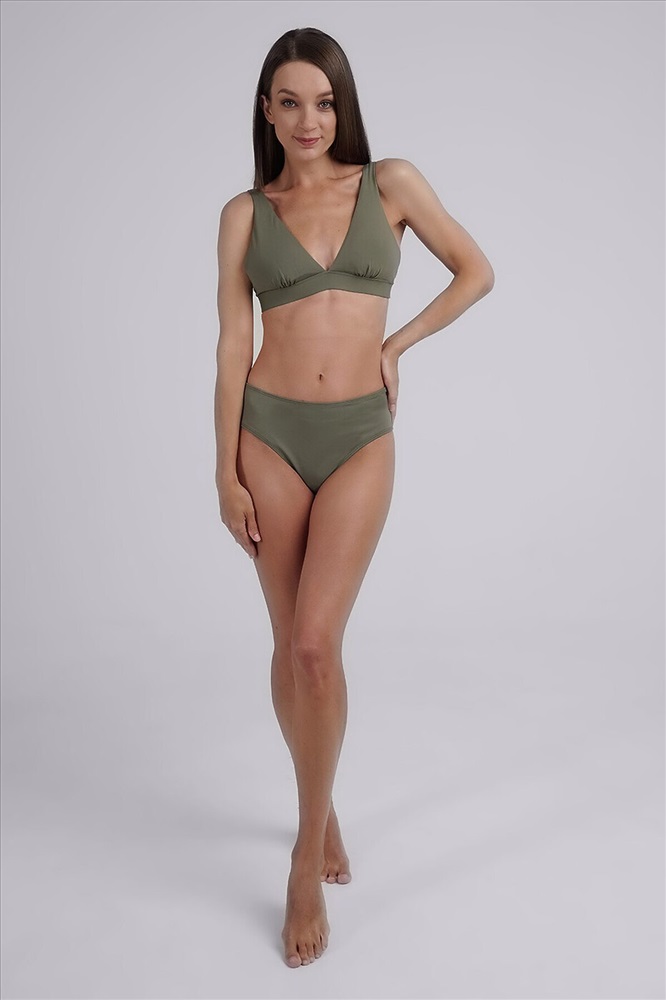 Костюм купальный женский однотонный из полиамида с эластаном, лиф с треугольными чашечками на регулируемых бретелях с магнитной застежкой, трусы бикини с высокой посадкой.