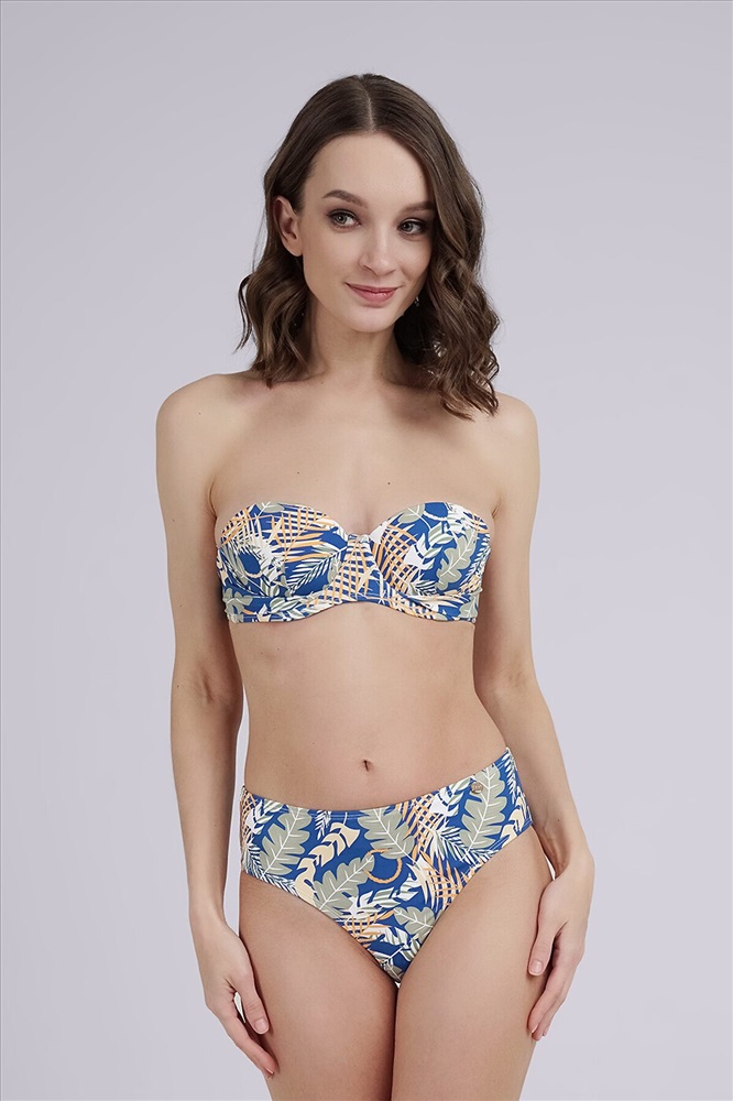 Костюм купальный женский из полиамида с эластаном. Лиф с круглыми чашечками с косточками, с завязками вокруг шеи, на магнитной застежке, трусы бикини на высокой посадке.