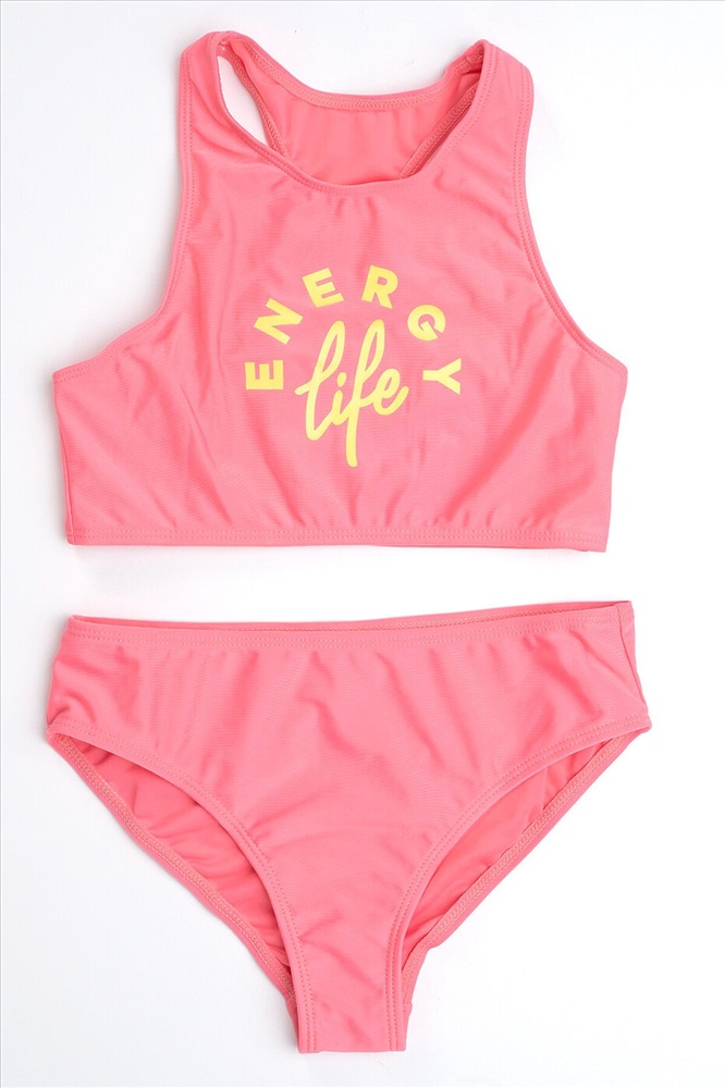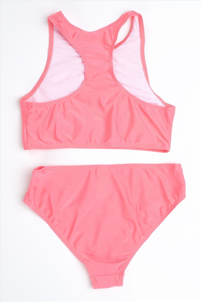 Раздельный купальник спортивного стиля. Плавки классические впереди на подкладе. Топ-майка с ярким принтом.