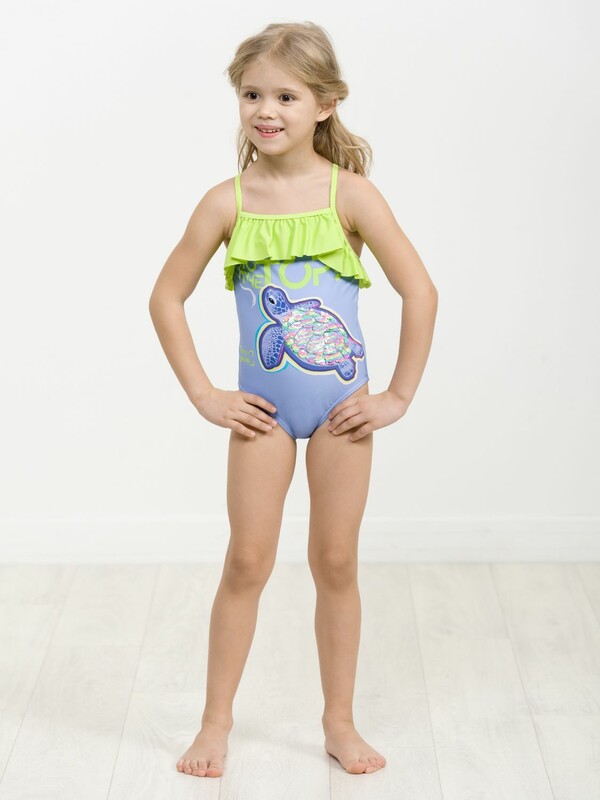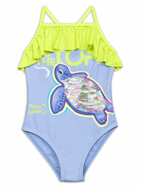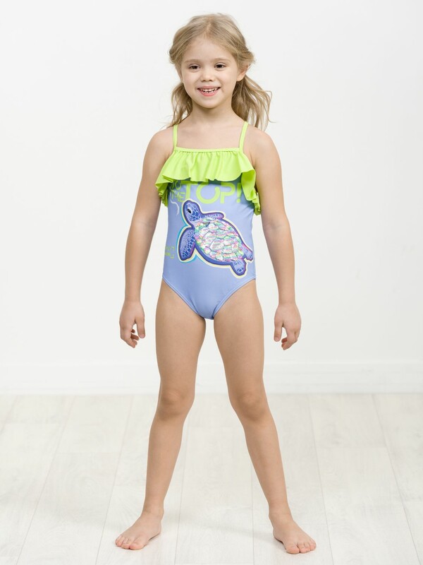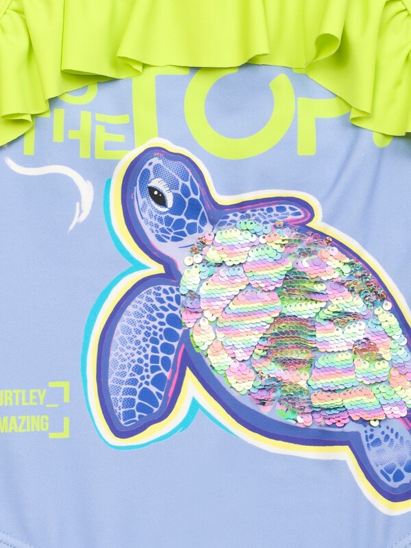 Слитный купальник на тонких лямках с регулировкой по длине. Перед продублирован подкладкой. Перевод принта Стремление вверх, в топ. Панцирь черепахи из двусторонних разноцветных пайеток.