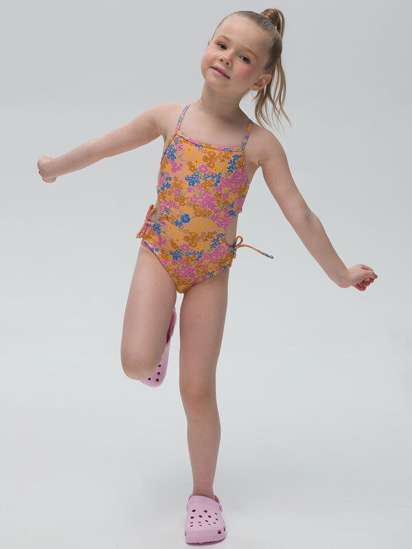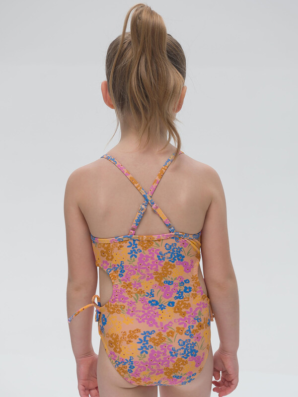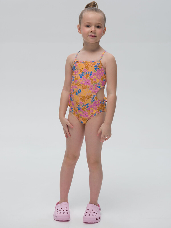 Купальник слитный для девочки. Мягкая эластичная ткань разработана специально для купальных костюмов и идеально садится по фигуре. Быстро сохнет и практически нет выгорания на солнце. По бокам купальника круглые отверстия, которые можно затянуть шнуром из основной ткани, что позволяет регулировать купальник по росту девочки. Лямки с регулировкой по длине. Подходит для пляжа, моря, бассейна.